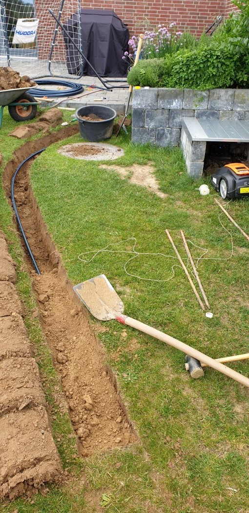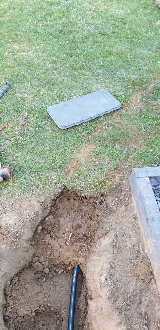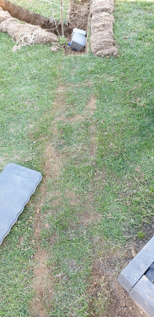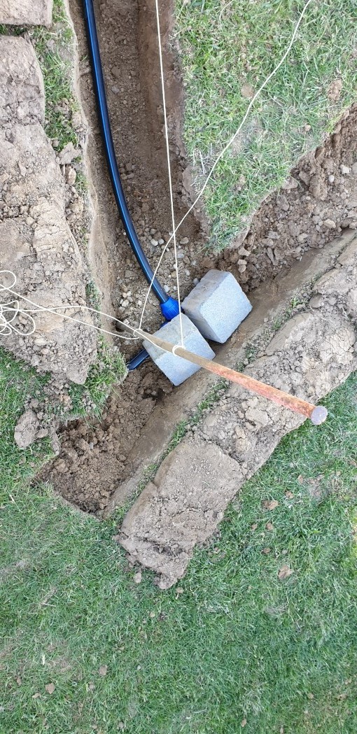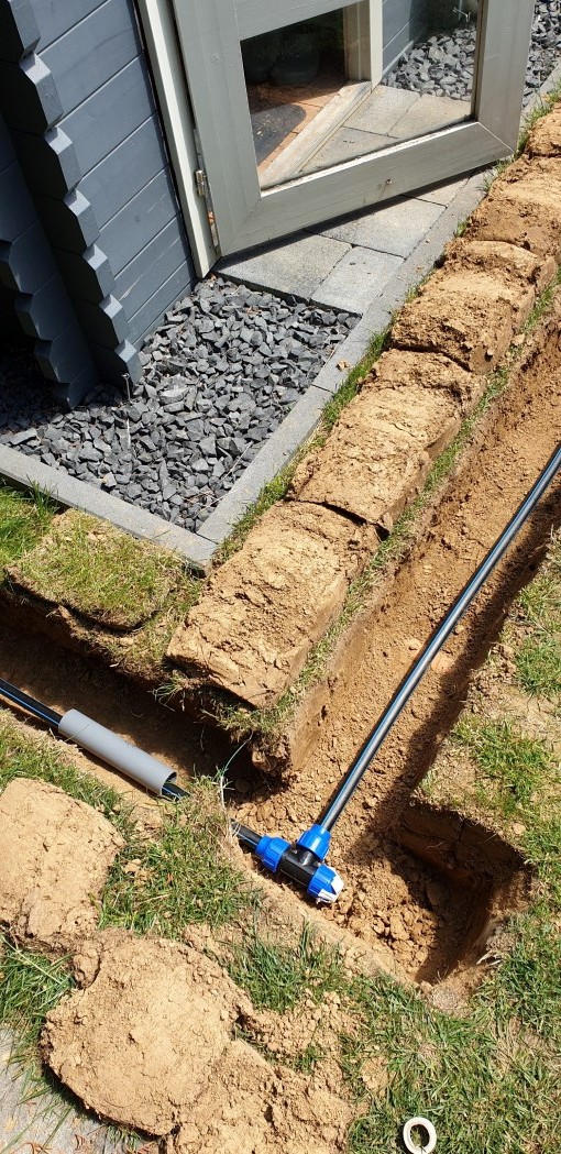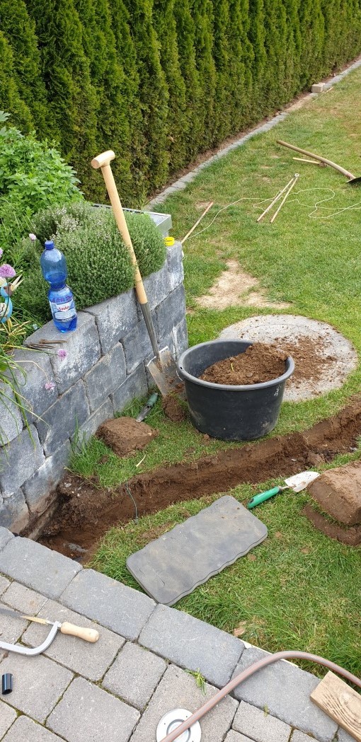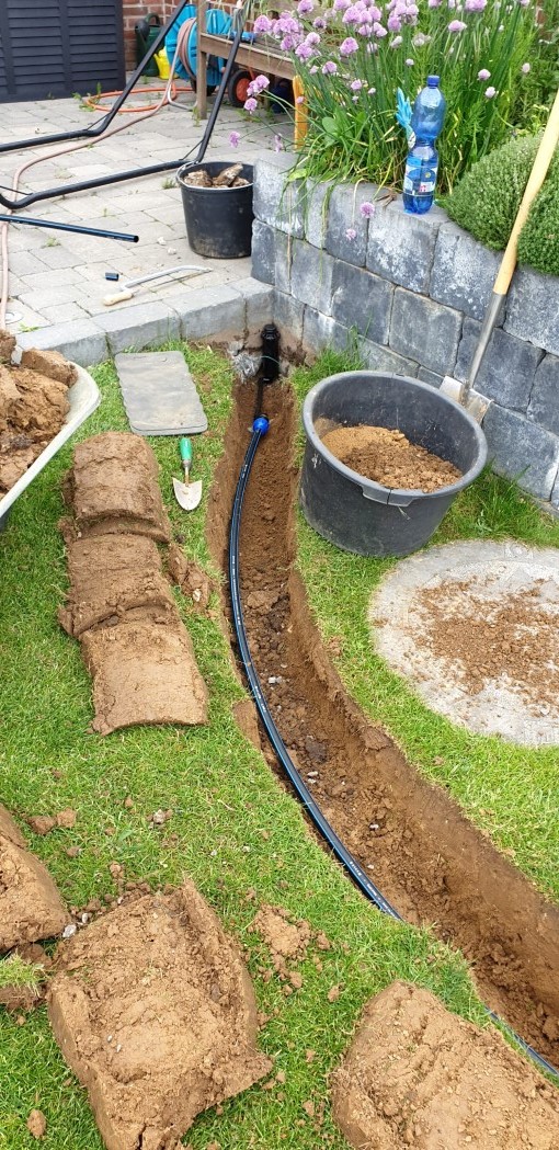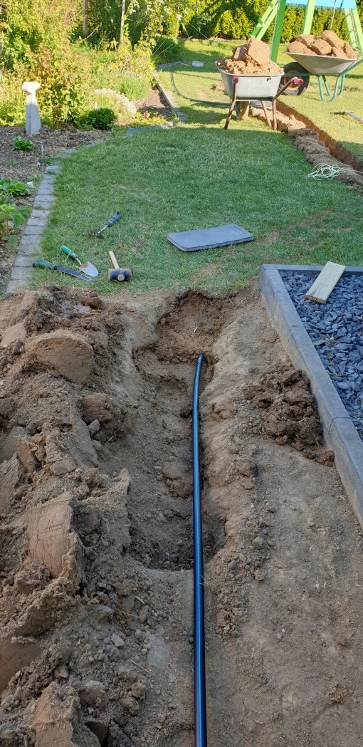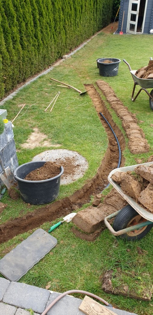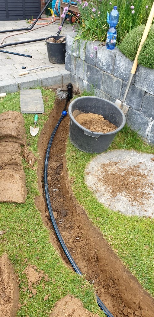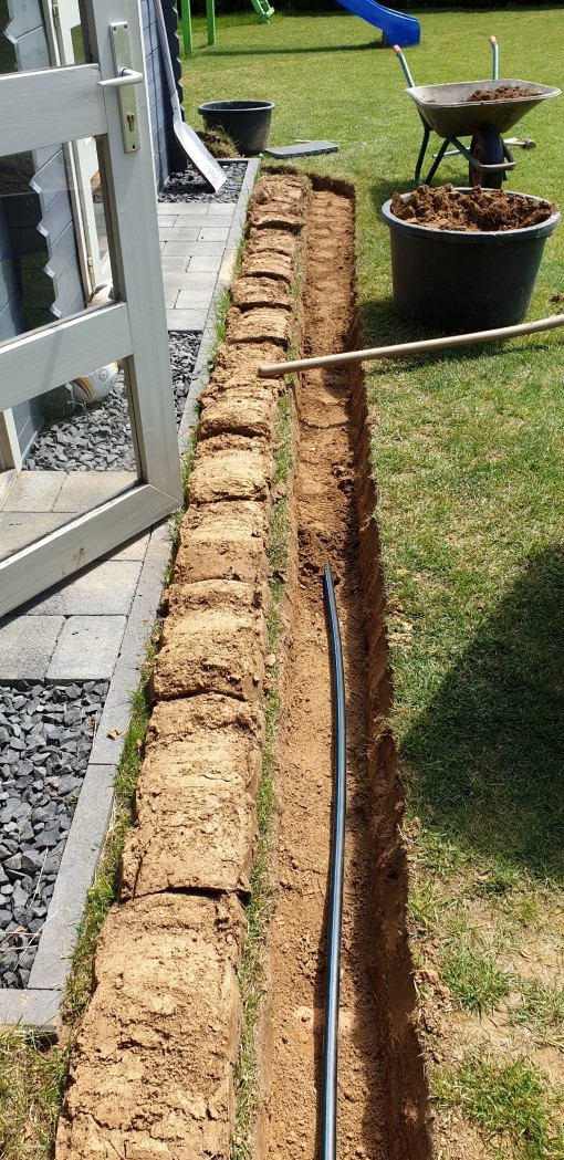 Nun kam das „uncoole“ an dem Projekt: Der Bodenaushub! Ich habe mit Hilfe von Metall-Stangen und Mauerschnur den geplanten Verlauf des Leitungsrohr auf dem Rasen geplant und dabei versucht möglichst effektiv vorzugehen, damit ich möglichst hohen Druck an den Ventilen habe. Als nächstes wurde die Grasnarbe abgestochen, vorsichtig auf Seite gelegt und der Bodenaushub vorgenommen. Hier bin ich auf Spatentiefe gegangen. Ich werde, wie auch alles andere bisher bei mir im Garten, zum Winter hin, die Leitungen mit Hilfe von Druckluft komplett Wasserfrei pusten. Habe den Mutterboden auf Schubkarren und in Spießbütten „geparkt“. Sektionsweise wurde das Rohr von mir in der Erde verlegt und dann auch wieder mit Mutterboden bedeckt. Danach konnte dann die Grasnarbe wieder aufgelegt werden. Habe diese dann mit einem Gummihammer angedrückt und in die korrekte Position gebracht. Noch ein Tipp am Rande: Das PE-Rohr bzw. die 100 Meter Rolle Rohr sind sehr widerspenstig. Hier solltet Ihr darauf achten, das vernünftig abzurollen und im Idealfall die Montage bei warmen Temperaturen vorzunehmen. Je wärmer bzw. je länger das Rohr in der Sonne liegt, desto einfacher lässt es sich damit arbeiten.