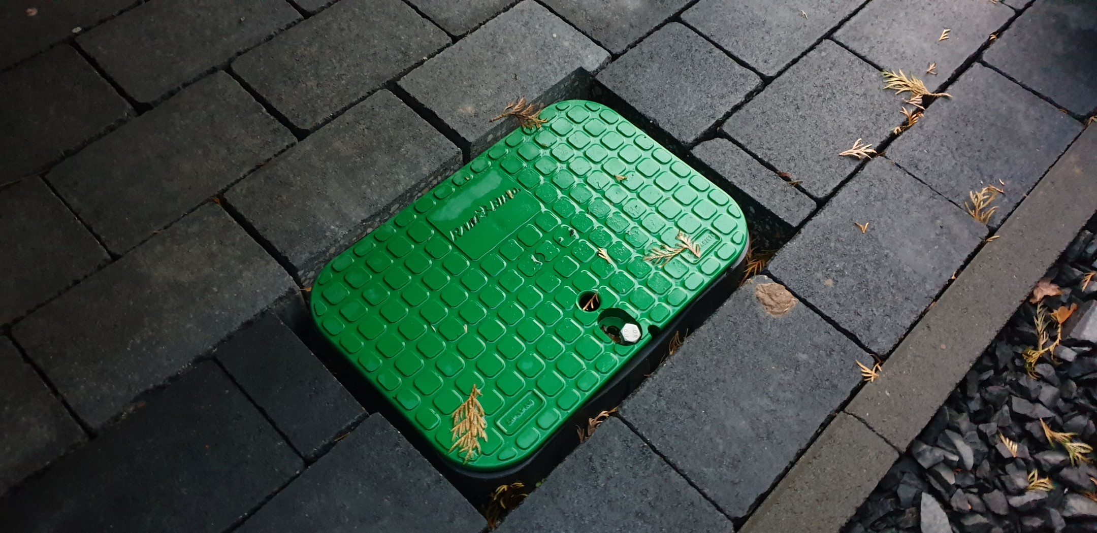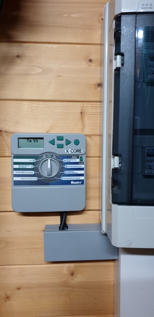 Da nach der Installation der Anlage dieser Bereich gepflastert wird, ist später nur noch der grüne Deckel im Boden zu sehen. Dieser lässt sich dann entfernen/anheben, um an die installierten Ventile zu gelangen. Die Ventile werden von einem simplen Hunter Beregnungscomputer angesprochen/gesteuert. Diesen positionierte ich im Inneren des Gartenhauses – es gibt allerdings auch die Varianten für die Outdoor Montage. Vom Inneren habe ich dann Steuerleitungen über Leerrohre nach außen in die Ventilbox verlegt und an die Ventile angeklemmt.