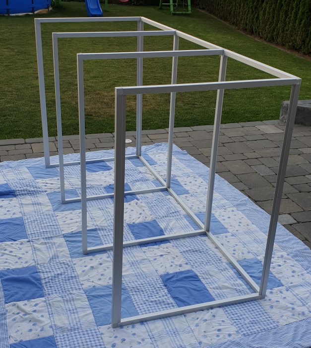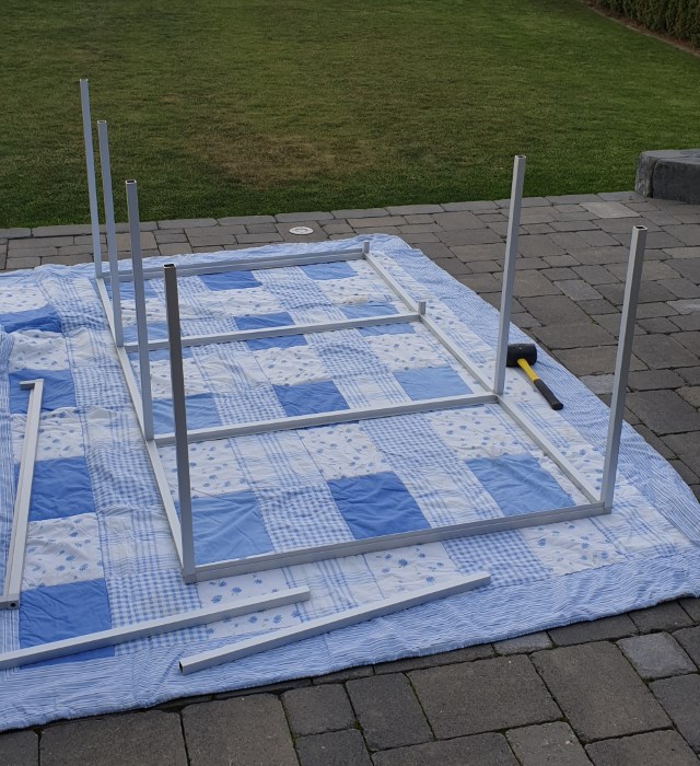 Das ging mit dem Material sehr gut von der Hand. Ich schätze, dass ich nach einer guten halben Stunde alle Profile mit ihren Steckverbindern verbunden hatte. Benötigt wird im Grunde nur ein Gummihammer zum Einschlagen der Verbinder und eine nicht federnde aber dennoch kratzfeste Unterlage. Entweder man unterlegt während des Einschlagens das Profil bzw. den Verbinder mit einem Holz oder man legt eine Decke auf einen festen Untergrund.