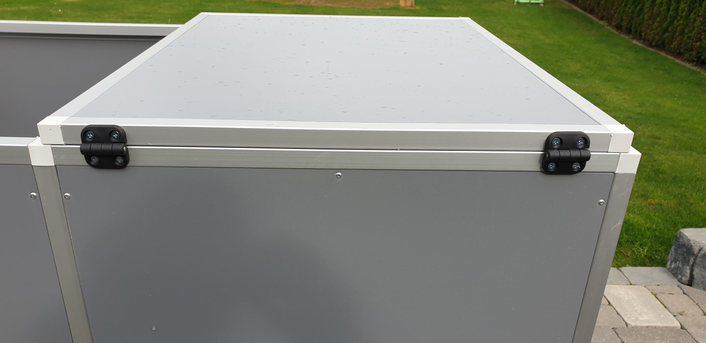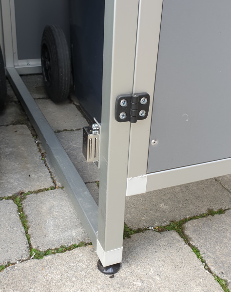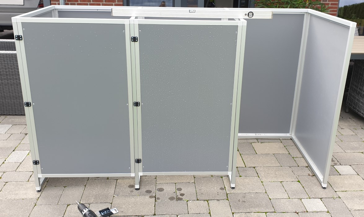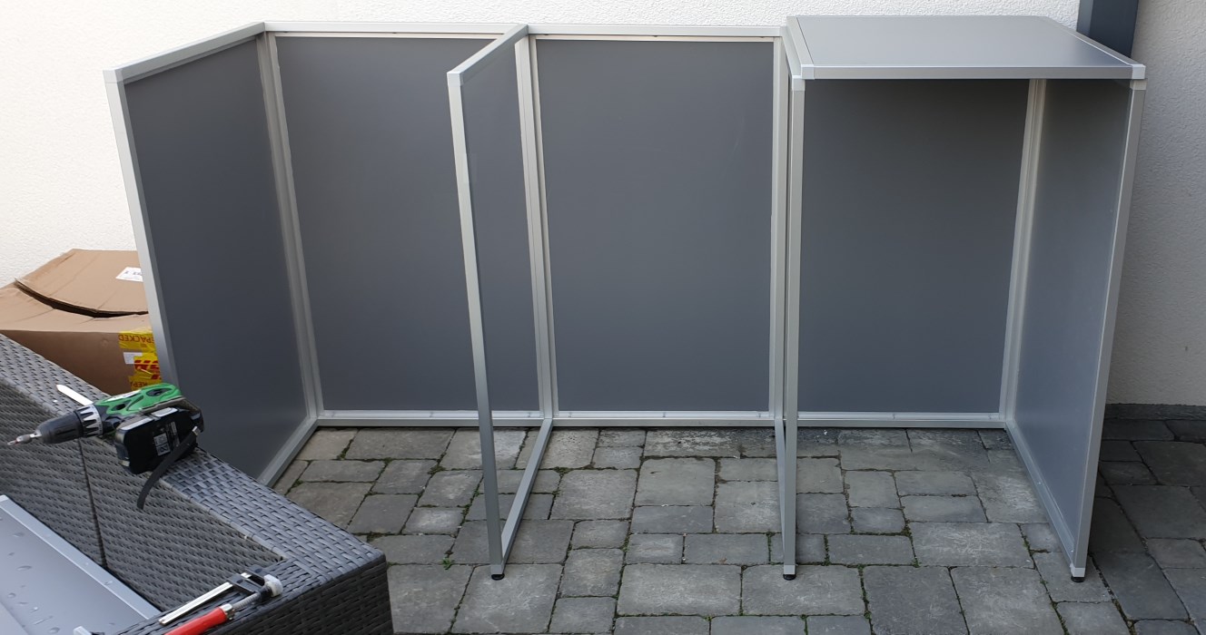Was soll die Box erfüllen? Sie soll neben den Türen zum Entnehmen der Mülltonnen auch jeweils einen Deckel für das Befüllen der Mülltonnen besitzen. Die Deckel sollen sich leicht öffnen lassen und im geöffneten Zustand den Mülltonnendeckel automatisch mitöffnen. Die ganze Box soll sehr leicht gebaut werden, damit man sie ggf. wegschieben / wegstellen kann. Außerdem sollten die Füße in irgendeiner Form justierbar sein, so dass man sie auf dem Untergrund anpassen kann.