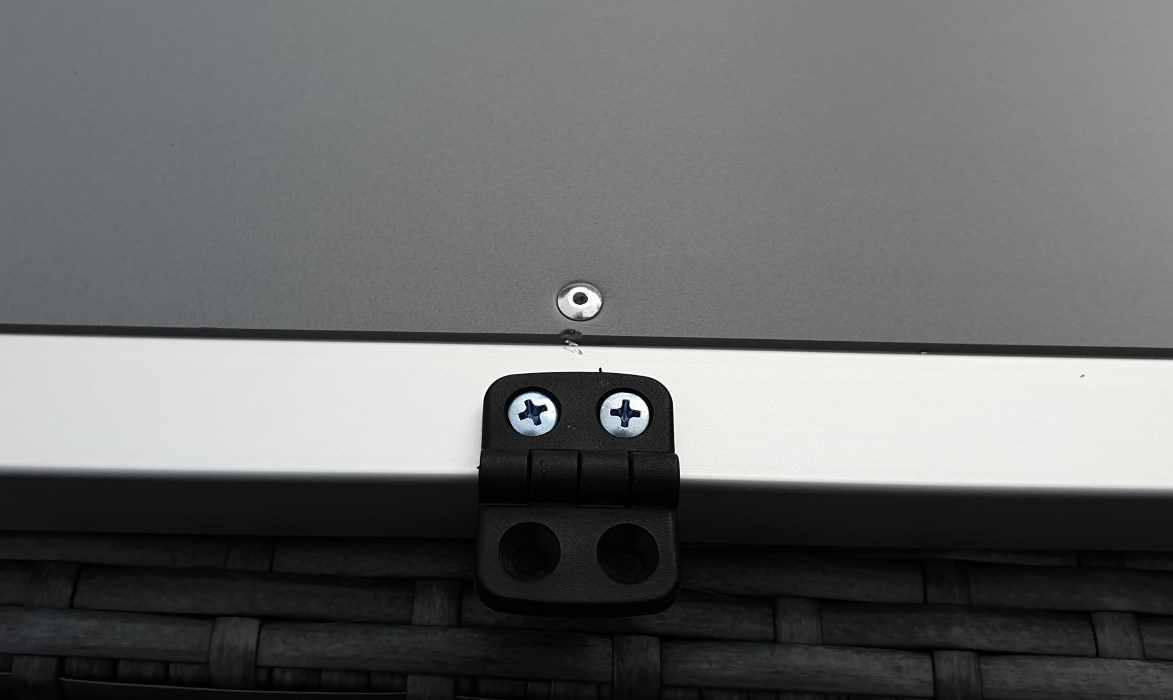 Nachdem nun alle Elemente mit den zugeschnittenen PVC Platten beplankt sind, können die Deckel und Türen mit Scharnieren versehen werden und am Grundkorpus verschraubt werden. An den Türen habe ich drei kleinere Scharniere verwendet, am Deckel zwei etwas größere. Dazu wurden die entsprechenden Stellen vorgebohrt und mit passenden Blechschrauben (teilweise Senkkopf, teilweise Rundkopf) verschraubt.
