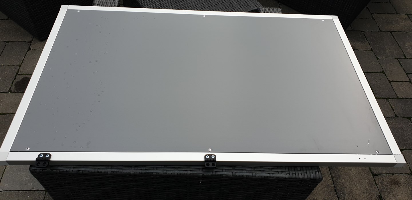 Als nächstes habe ich mir dann lange Gedanken gemacht, mit welchem Material ich den Korpus, die Deckel und Türen verkleide bzw. beplanke. Hier kann man auch wieder viel Geld ausgeben. Man könnte WPC Platten, Plexiglas, Holz in allen möglichen Variationen, Kunststoff, Acryl, HPL Platten oder Siebdruckplatten verwenden. Ich habe aufgrund des Gewichts mich mal für etwas „anderes“ entschieden und PVC Platten bestellt. Diese sind u.a. in 3 mm Stärke, online passend zugeschnitten, bestellbar. Gesagt – getan. Nach ein paar Tagen trafen dann auch diese bei mir ein und konnten montiert werden.