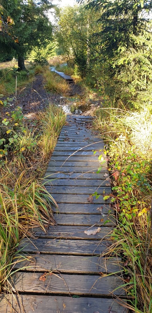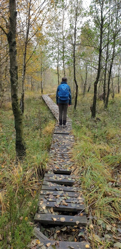 Ihr solltet euch entsprechend kleiden – vor allem das Schuhwerk sollte passen. Wir sind mit halbhohen Wanderschuhen unterwegs gewesen. Da es sich hier um ein Hochmoor handelt, kann es jederzeit passieren, dass man mit dem Schuh entsprechend tief ins Erdreich eintaucht (auch wenn es zuvor gar nicht danach ausgesehen hat – glaubt mir, ich weiß genau, wovon ich spreche… :-)). Nehmt auf jeden Fall Wechselkleidung für nach der Wanderung mit. Wenn es die Tage vor der Wanderung entsprechend geregnet hat, ist die Wahrscheinlichkeit hoch, dass die Kleidung entsprechend eingesaut wird.