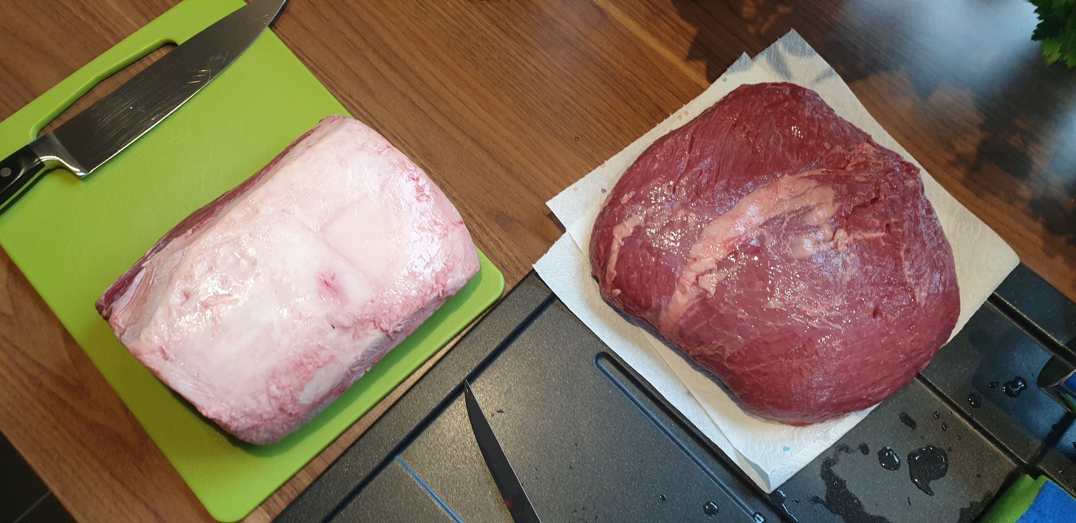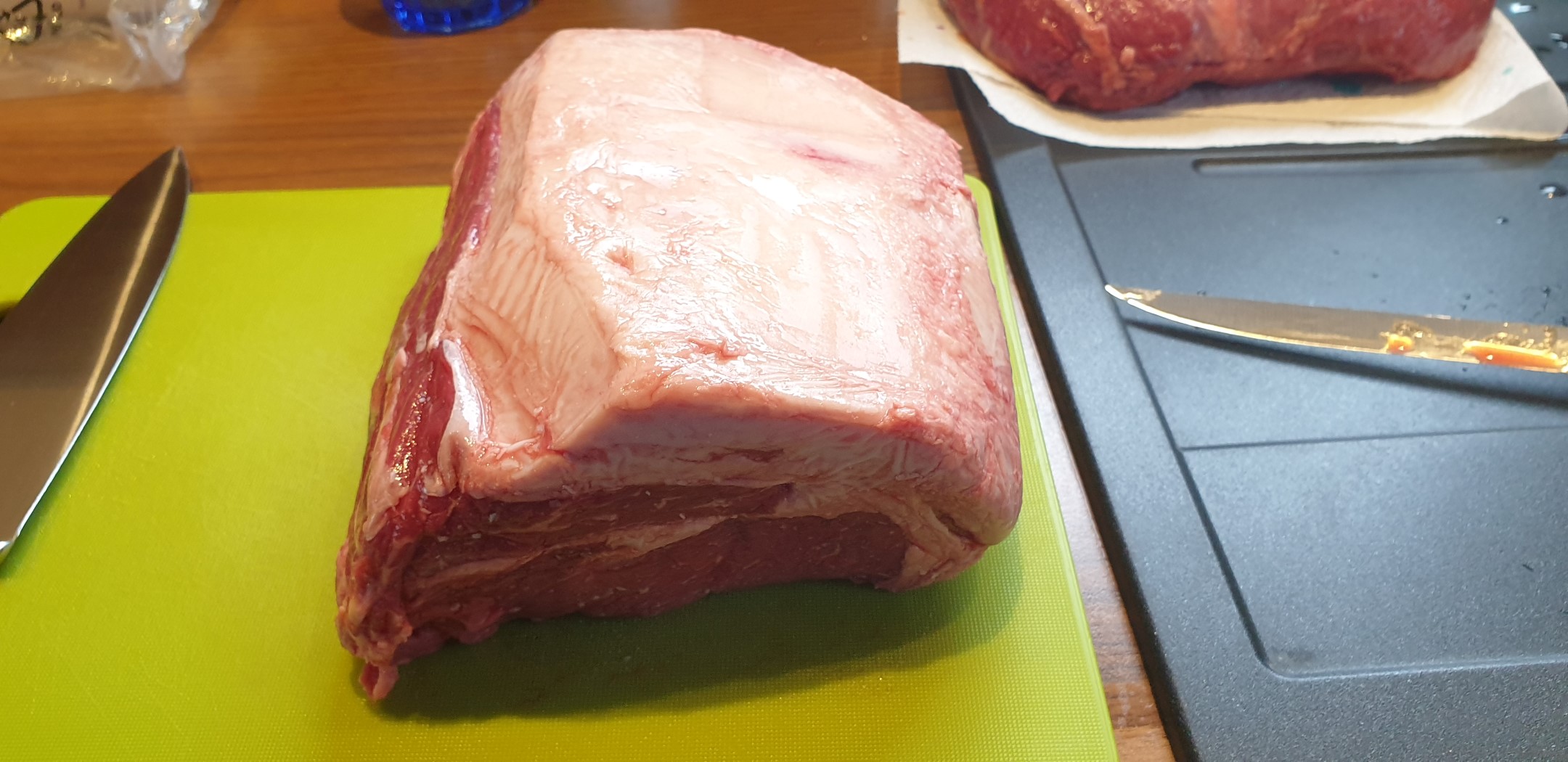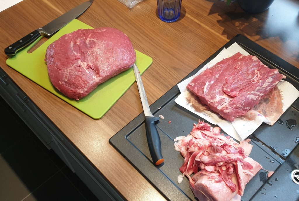 Wie der Titel dieses Beitrags schon beschreibt, habe ich dieses Mal Roastbeef mit einer Kräutersenfkruste auf dem Gasgrill gegrillt. Als Ausgangsmaterial muss man aber nicht zwingend Roastbeef verwenden, auch die günstigere Rinderhüfte eignet sich sehr gut für dieses Rezept. Ich habe das Fleisch wieder mal bei der METRO besorgt. Zum Austesten habe ich diese Mal ein Stück Roastbeef und ein Stück Hüfte verarbeitet. Beide Stücke wurden von mir sorgfältig pariert, so dass auf den Außenseiten so gut wie kein Fett mehr vorhanden war – aber seht selbst: