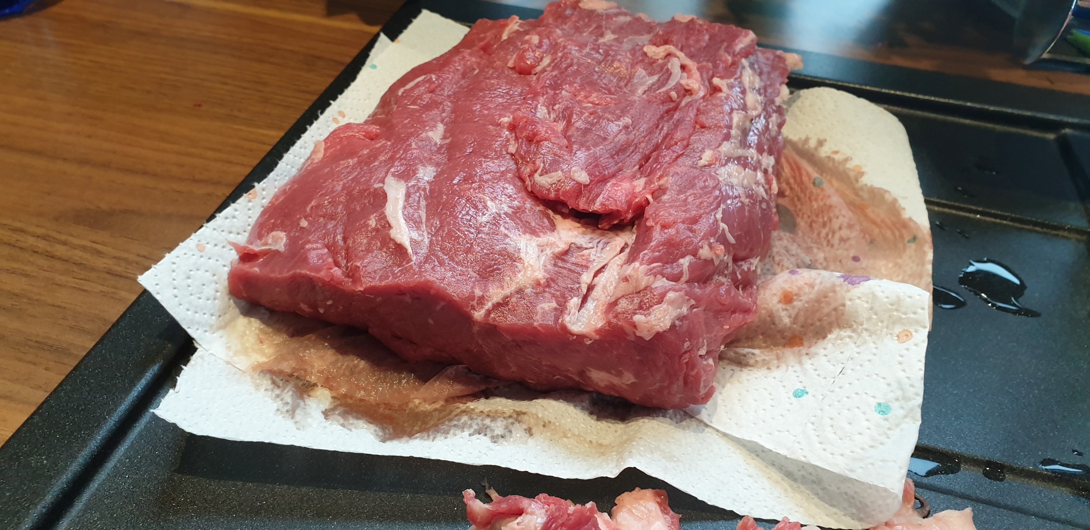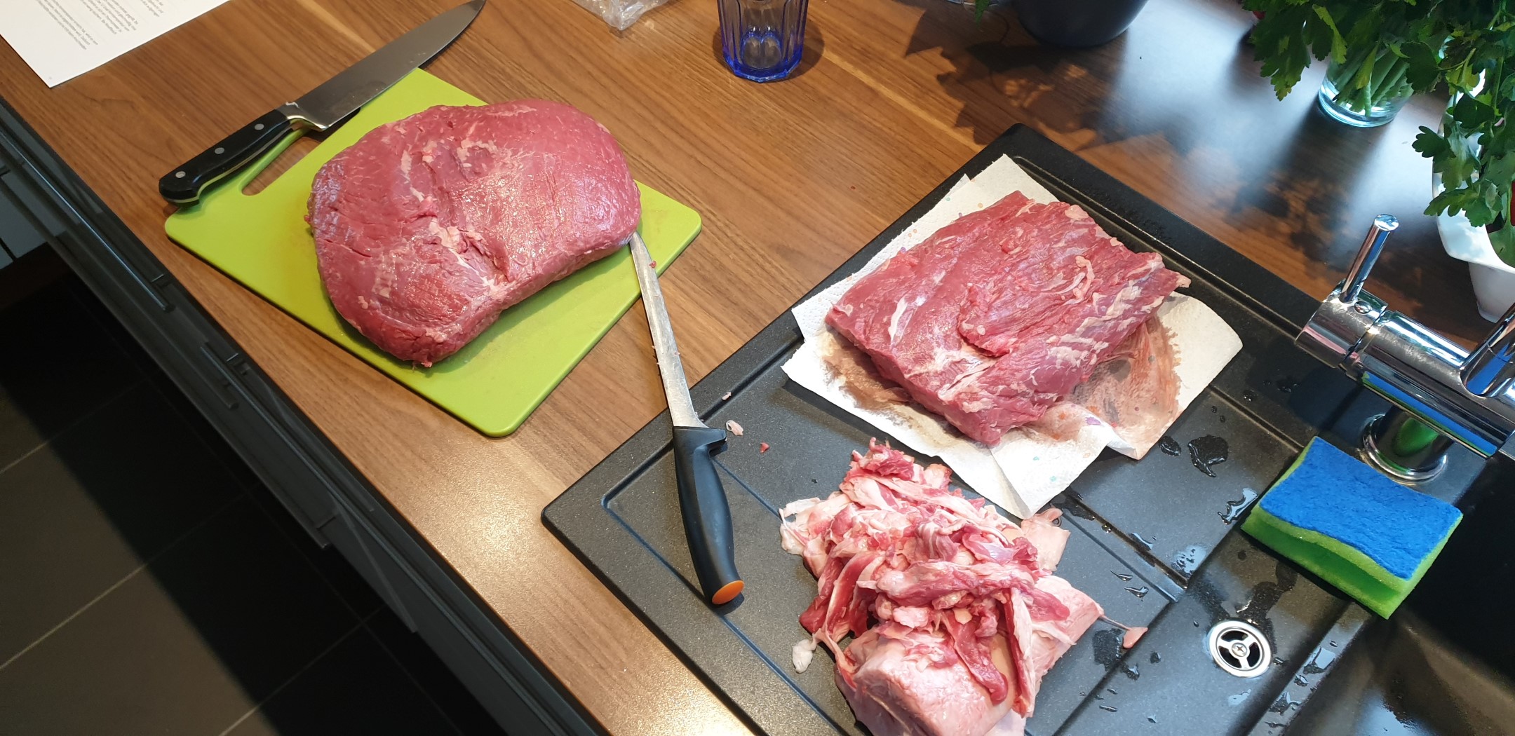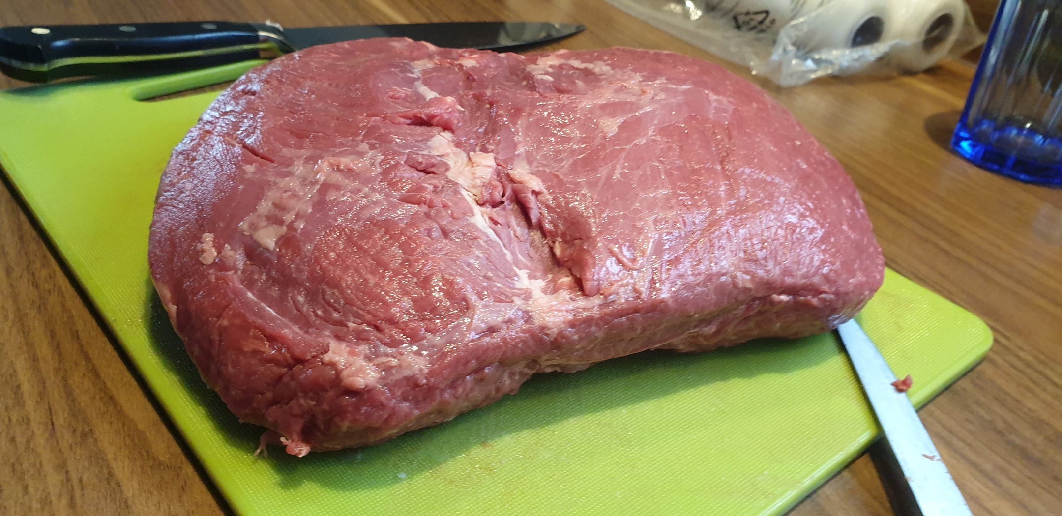 Wie der Titel dieses Beitrags schon beschreibt, habe ich dieses Mal Roastbeef mit einer Kräutersenfkruste auf dem Gasgrill gegrillt. Als Ausgangsmaterial muss man aber nicht zwingend Roastbeef verwenden, auch die günstigere Rinderhüfte eignet sich sehr gut für dieses Rezept. Ich habe das Fleisch wieder mal bei der METRO besorgt. Zum Austesten habe ich diese Mal ein Stück Roastbeef und ein Stück Hüfte verarbeitet. Beide Stücke wurden von mir sorgfältig pariert, so dass auf den Außenseiten so gut wie kein Fett mehr vorhanden war – aber seht selbst:
