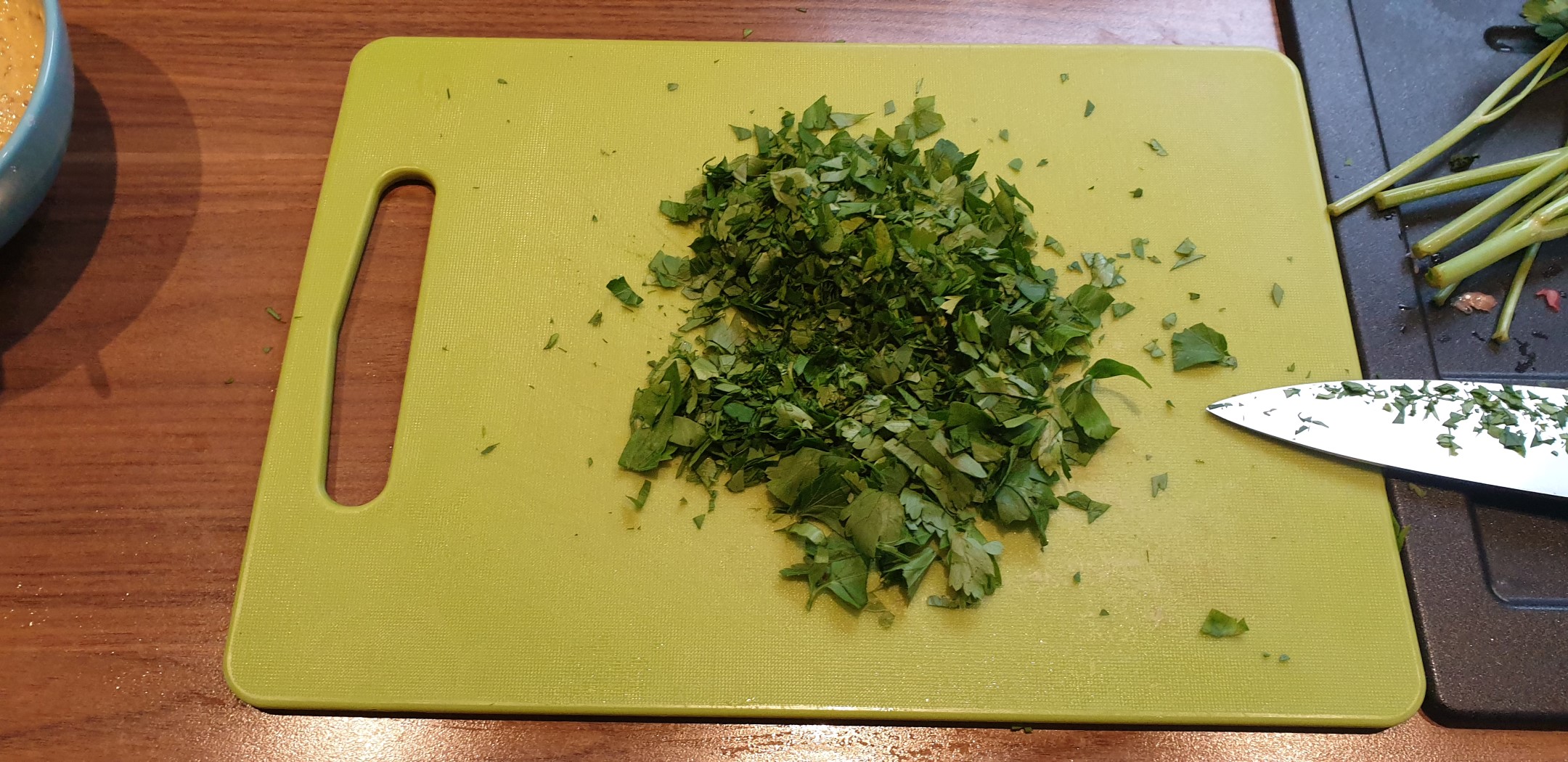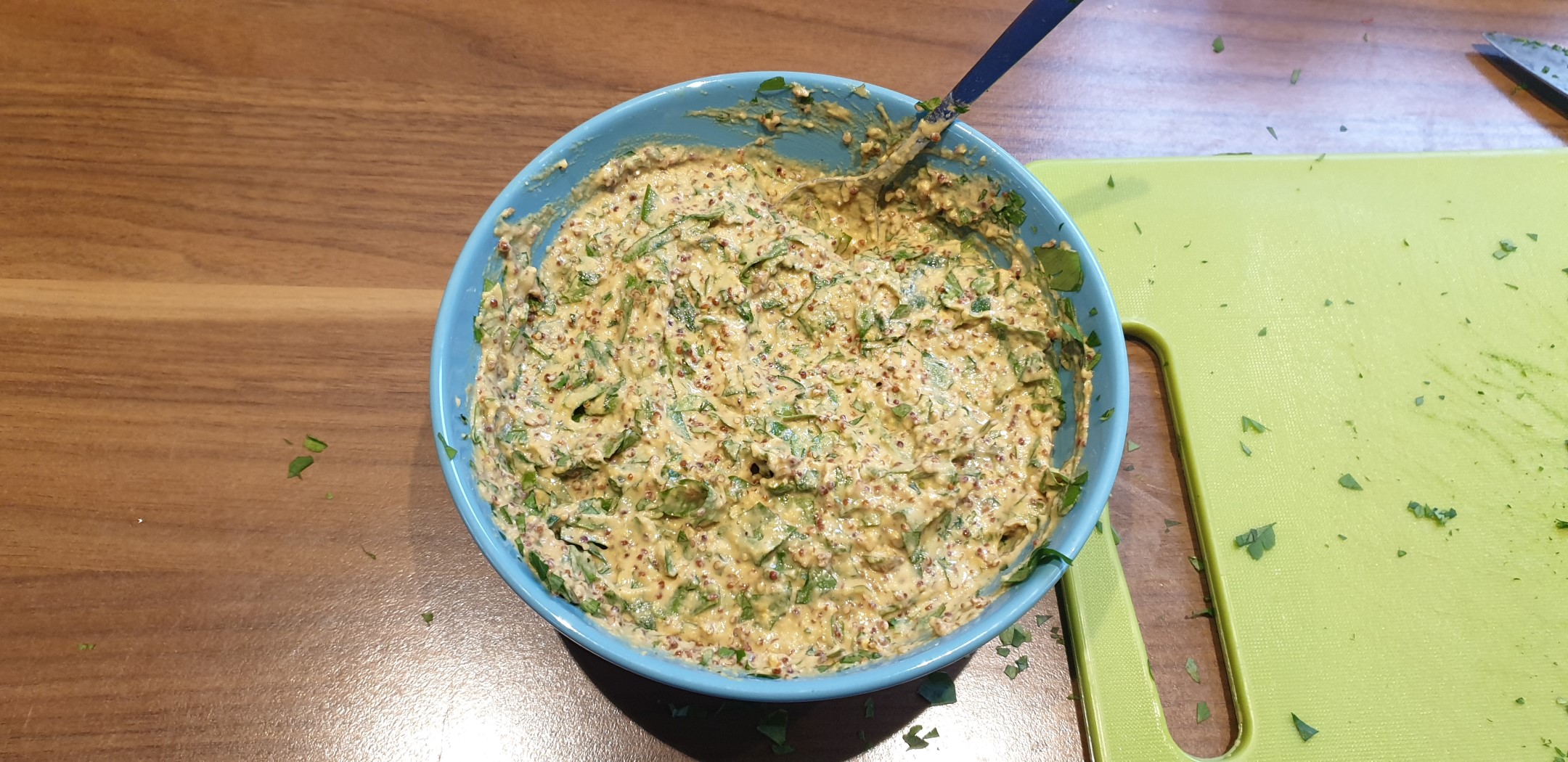 Die Petersilie wird schön klein gehackt und dann mit den genannten Zutaten zu einer schönen cremigen Paste vermischt. Ich persönlich verwende immer ein mildes Olivenöl. Natürlich kann man zusätzlich zur Petersilie noch weitere frische Kräuter geben.