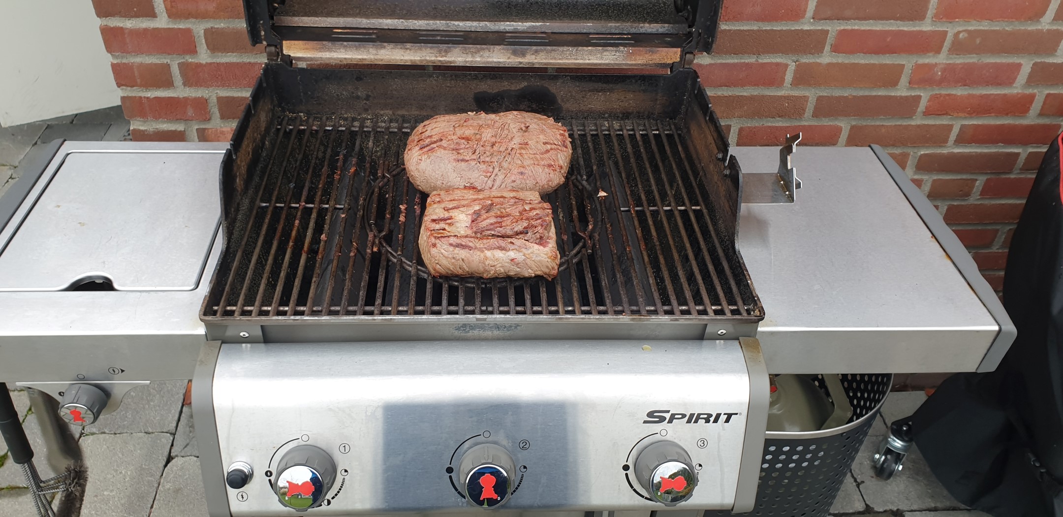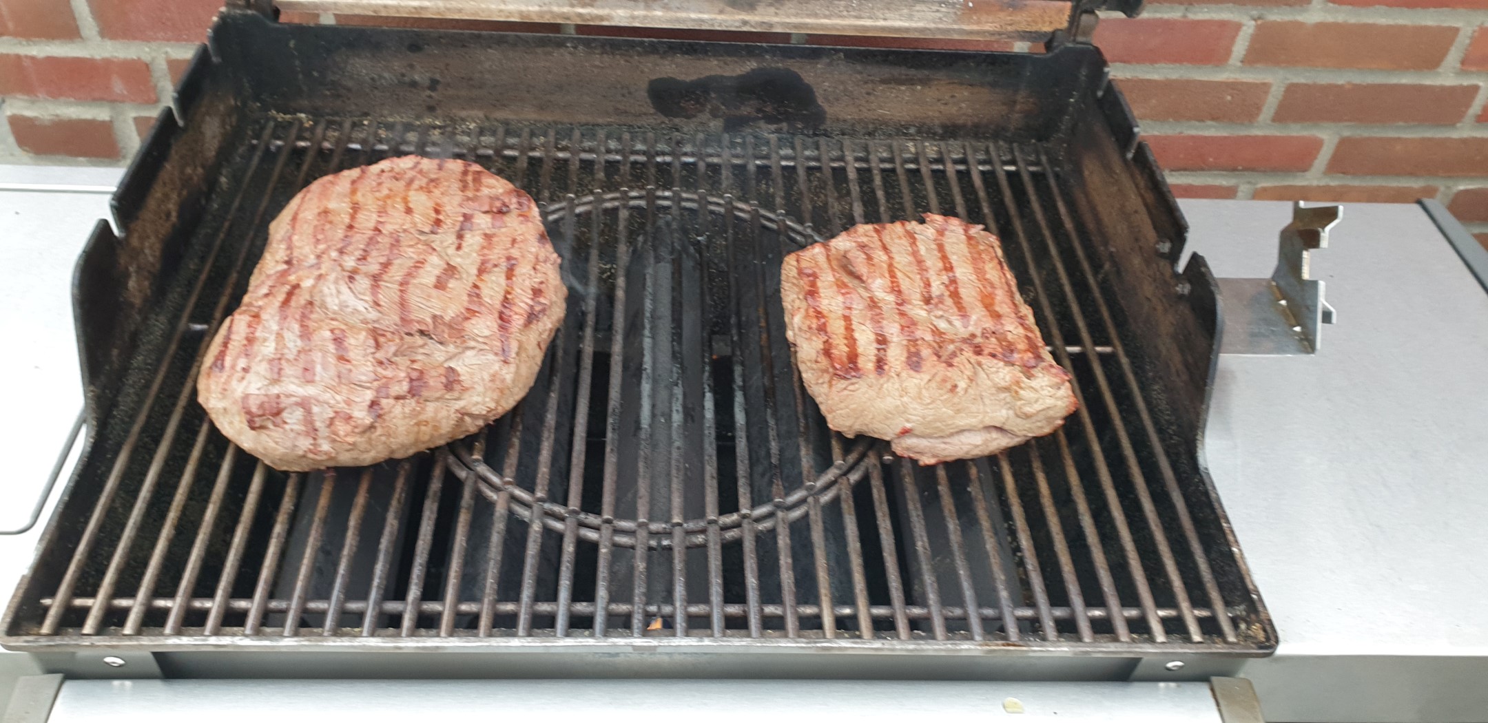 Den Grill solltet Ihr für hohe Hitze (am besten >250°C) vorbereiten. Hat der Grill seine Temperatur erreicht wird das Roastbeef beidseitig für ca. drei Minuten scharf angegrillt, um die benötigten Röstaromen zu erhalten. Diese sind für den finalen Geschmack sehr wichtig!