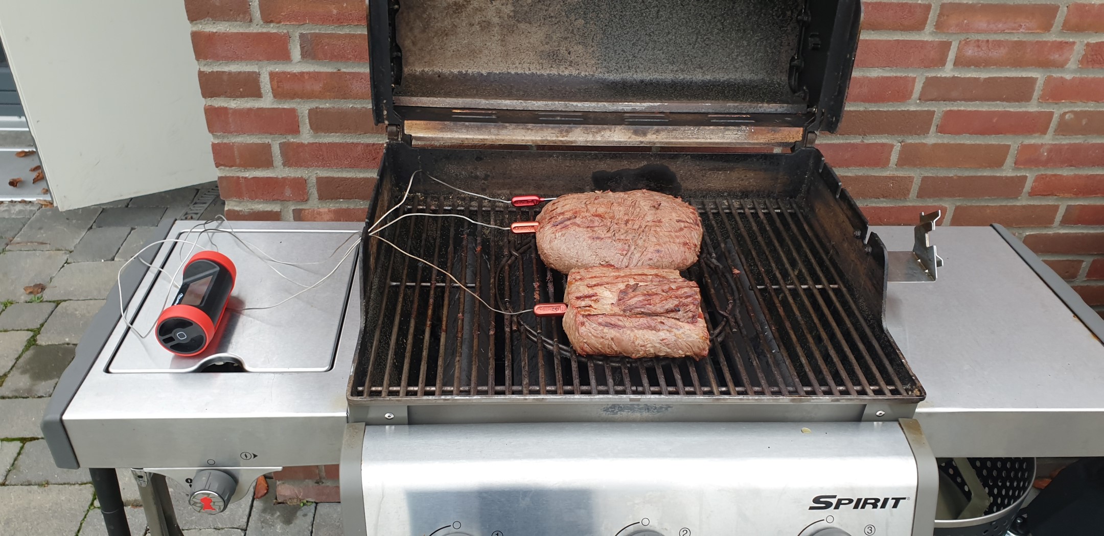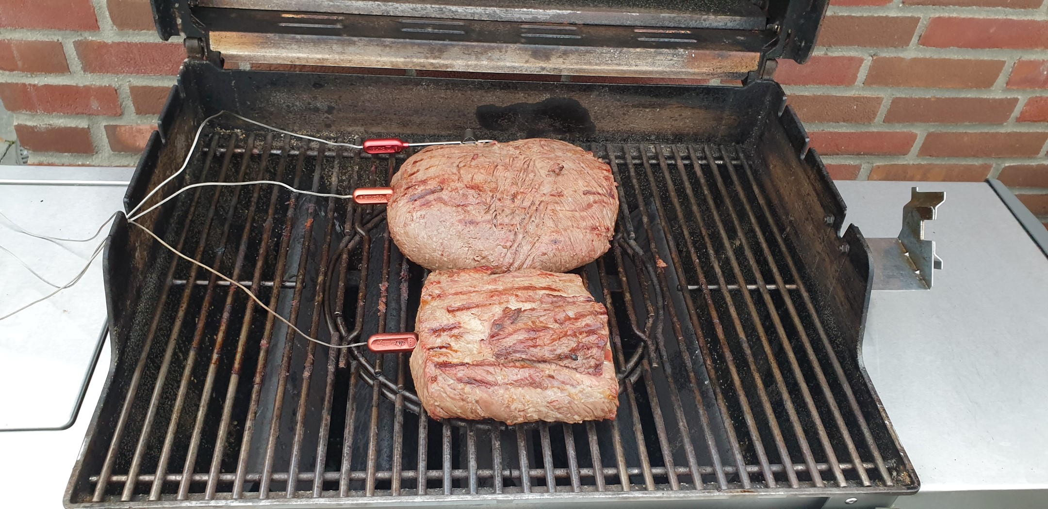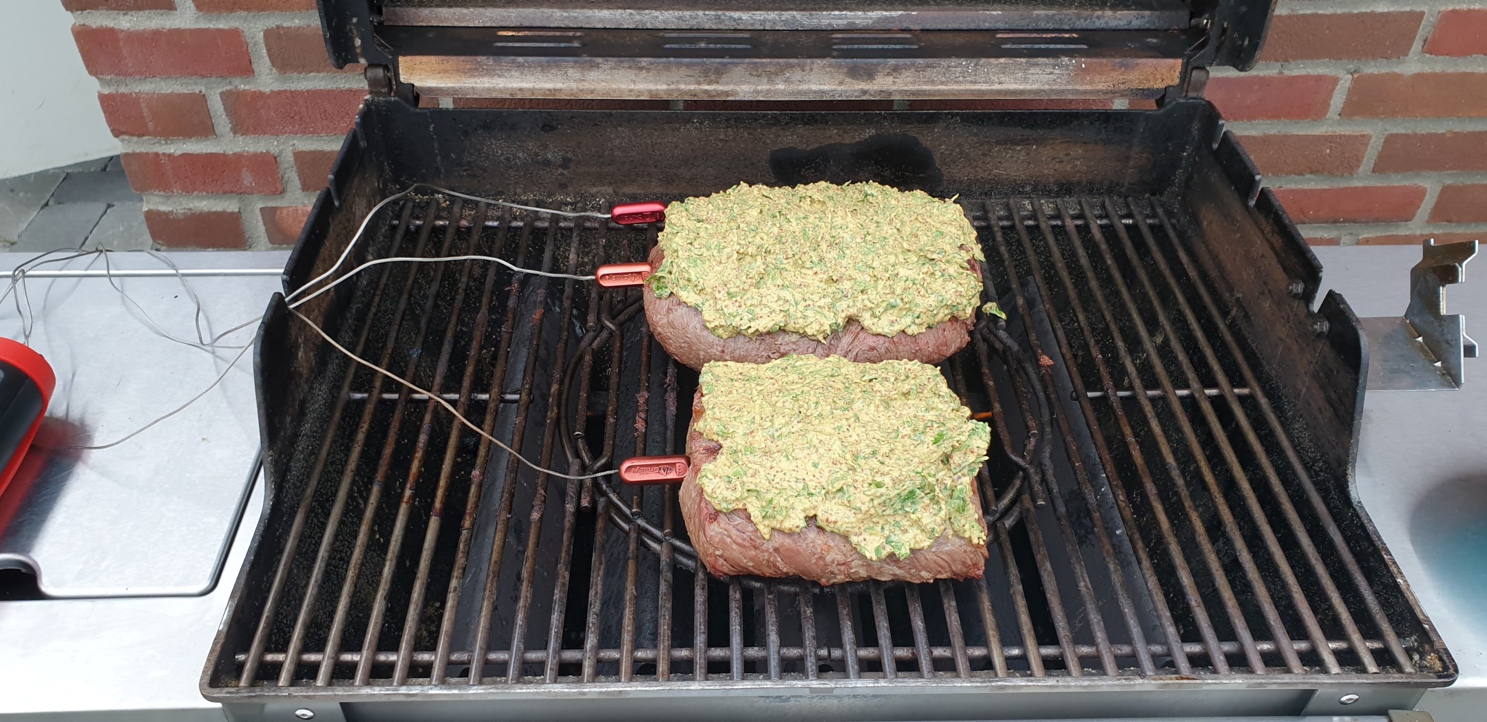 Das Fleisch wird nach dem Parieren von allen Seiten mit etwas Olivenöl eingerieben und mit groben Meersalz gewürzt. Nun wird das Fleisch noch mit Temperatursensoren versehen, um es später auf den gewünschten Gargrad zu bekommen. Ich verwende hier mittlerweile das GrillEye Pro Plus oder das Maverick ET 733 Thermometer. Zusätzlich wird noch ein weiterer Sensor im Garraum des Grills untergebracht. Nun sind alle Vorbereitungen abgeschlossen und das eigentliche Grillen kann beginnen.
