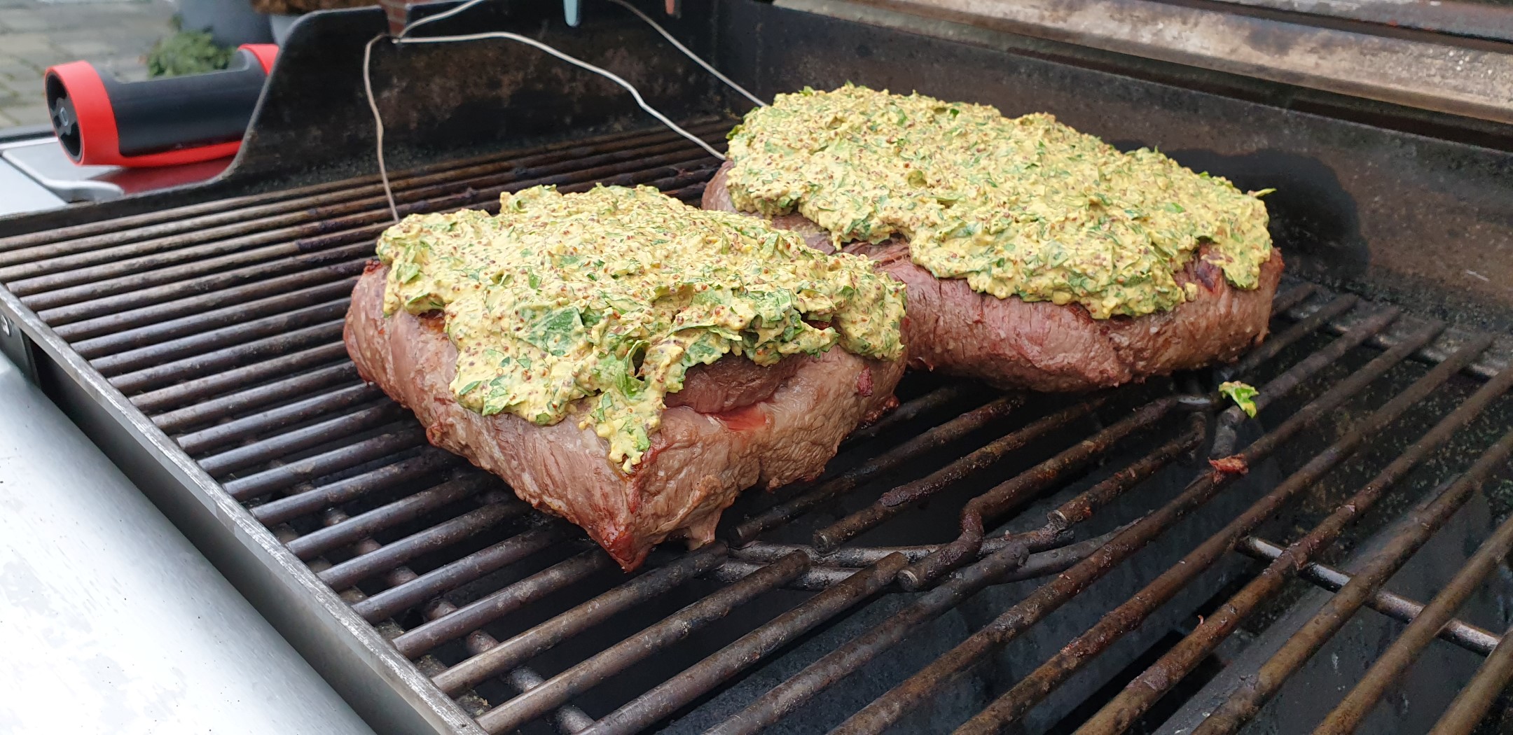 Ist das Roastbeef nun beidseitig scharf angegrillt, kümmern wir uns um die Kräutersenfkruste. Die vorbereitete Paste wird nun auf der Oberseite des Fleisches aufgebracht. Mit einem Marinierpinsel oder einem Löffel kann die Paste schön verteilt werden. Ich trage hier ca. einen halben Zentimeter Paste auf. Ist diese schön auf dem Fleisch verteilt, geht es direkt ‚runter mit der Temperatur. Ihr müsst den Grill nun auf indirektes Grillen einstellen – unter dem Fleisch darf jetzt keine direkte Hitze mehr entstehen! Das Roastbeef wird nun bei 120°C etwa drei Stunden indirekt gegrillt. Die niedrige Temperatur sorgt dafür, dass das Roastbeef schön zart und saftig wird. Hat das Fleisch eine Kerntemperatur von 56°C erreicht ist es medium und gleichmäßig rosa im Kern. Aus meiner Sicht, ist das der perfekte Gargrad für Roastbeef. Durch die aufgebrachte Kräutersenfkruste benötigt man keine zusätzliche Soße.