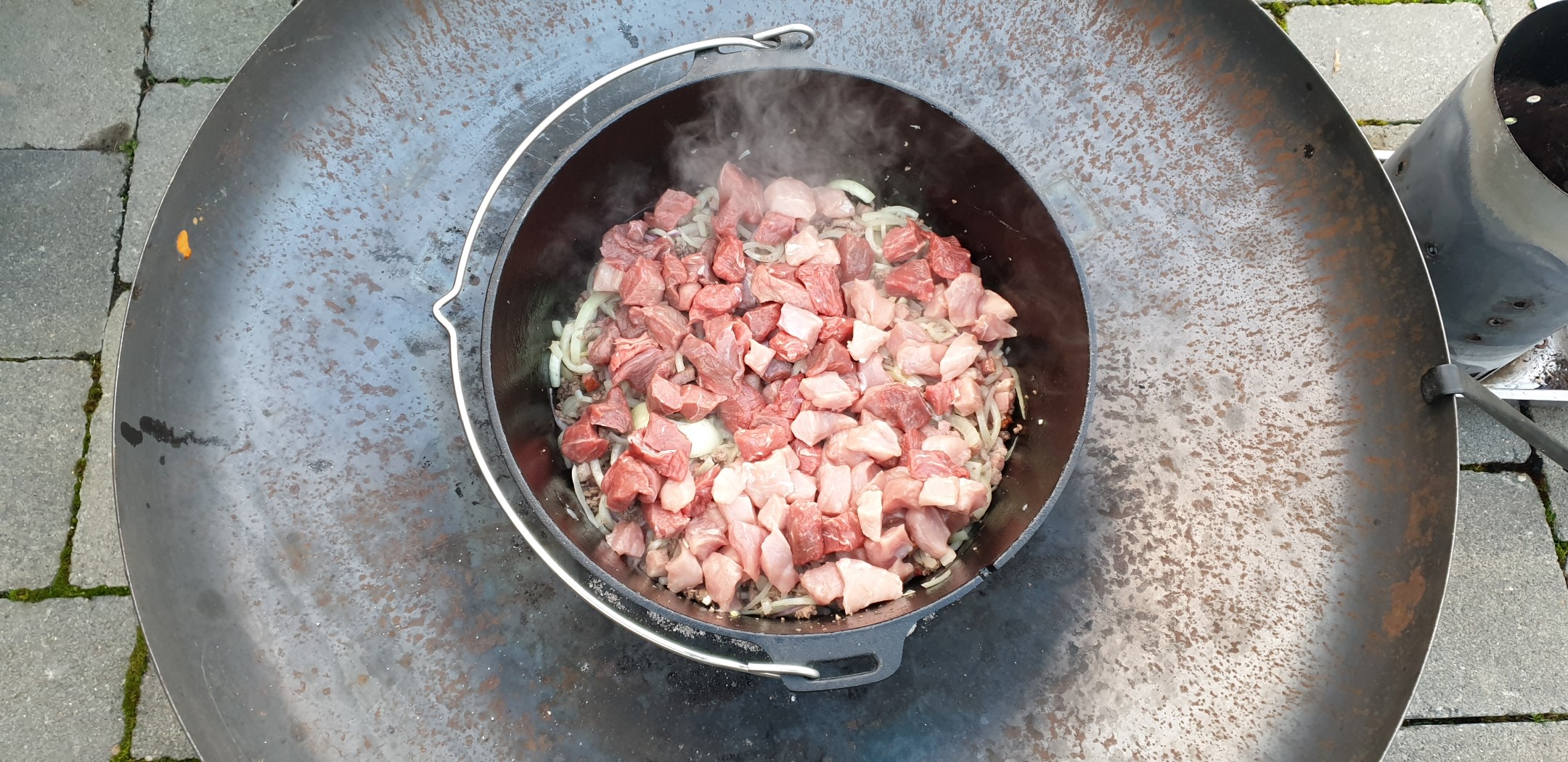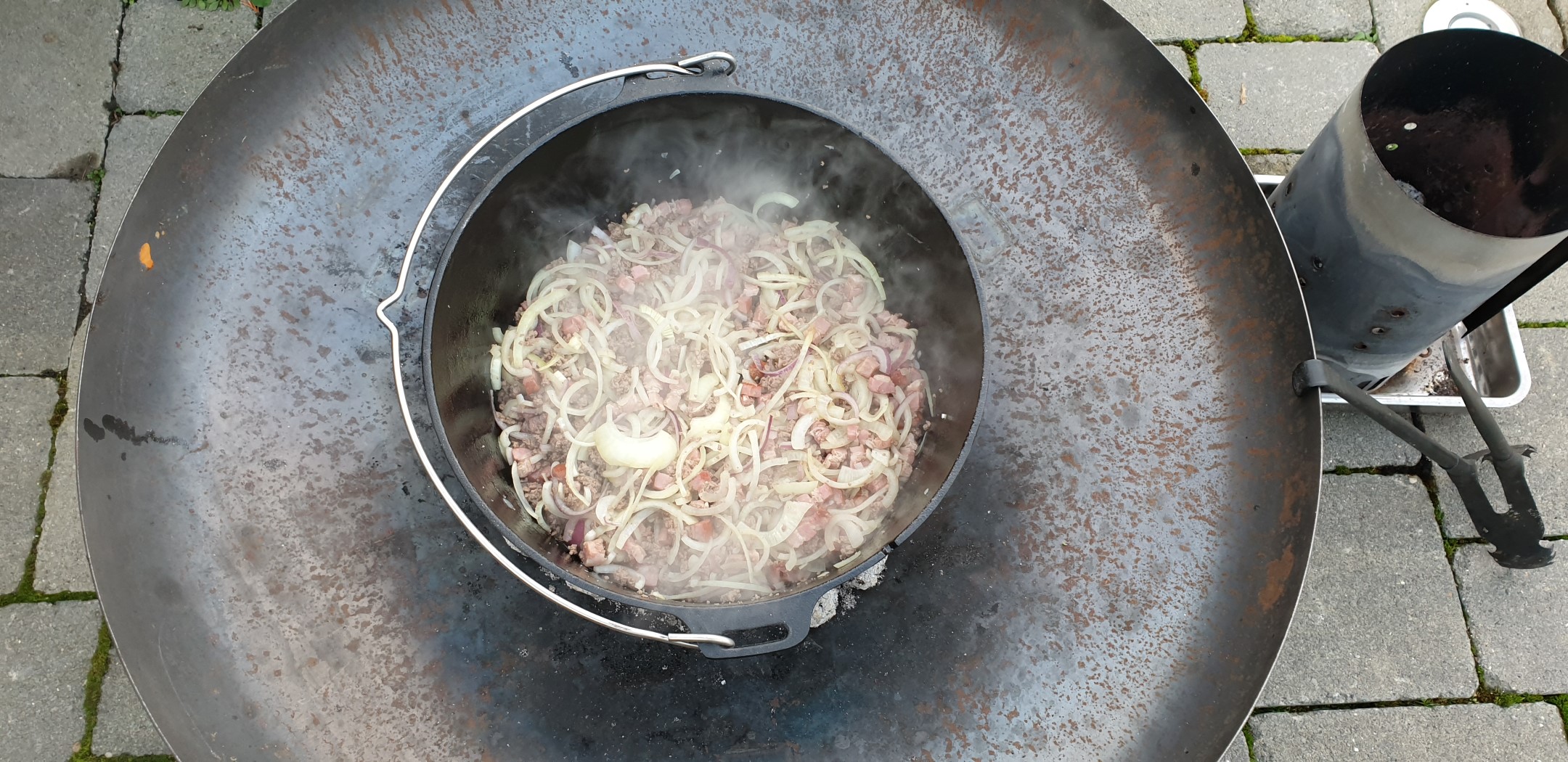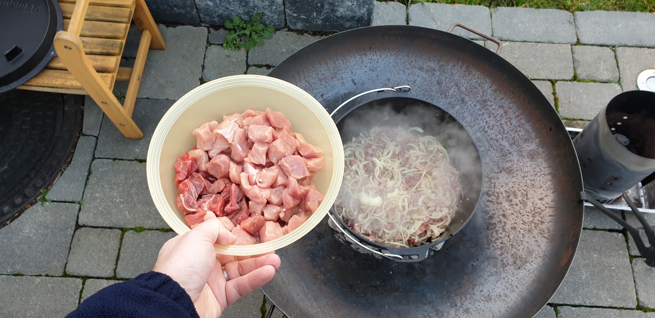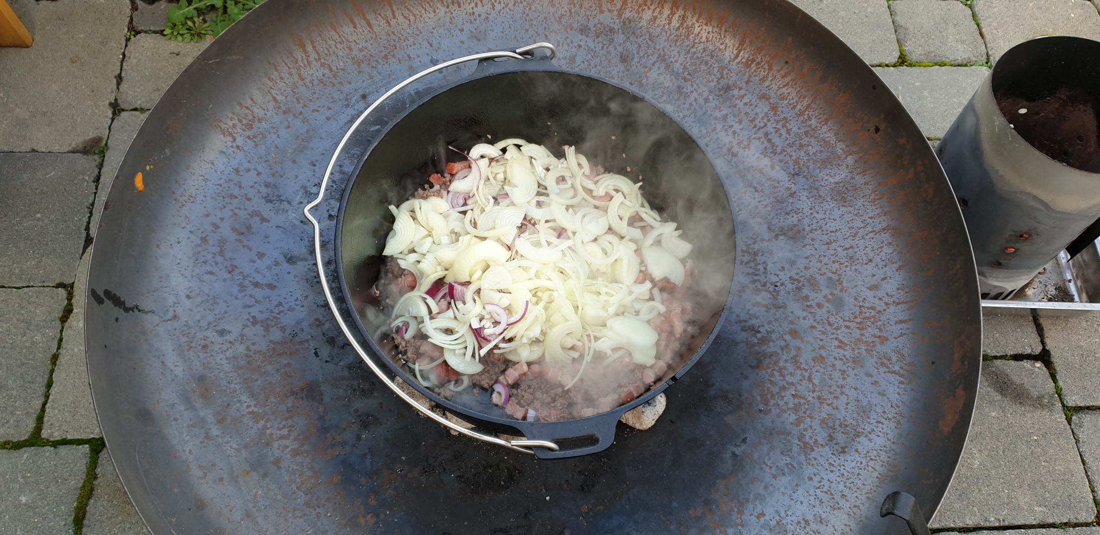 Als erstes wird der Speck von allen Seiten etwas im Dopf angebraten. Danach fügt ihr das Gehackte hinzu. Dieses wird dann so lange angebraten, bis es schön „krümelig“ geworden ist und etwas Farbe angenommen hat. Nun gebt Ihr die geschnittenen Zwiebeln hinzu und bratet die Zutaten weiter kurz an. Nun kommt als nächstes der Gulasch hinzu. Etwas befremdlich ist es, dass bei einem Pfundstopf der Gulasch zuvor nicht angebraten, sondern direkt in den Dutch Oven gegeben wird. Deswegen ist es auch wichtig, dass der Dopf gut eingeölt ist. Lieber zu viel Öl, als zu wenig!