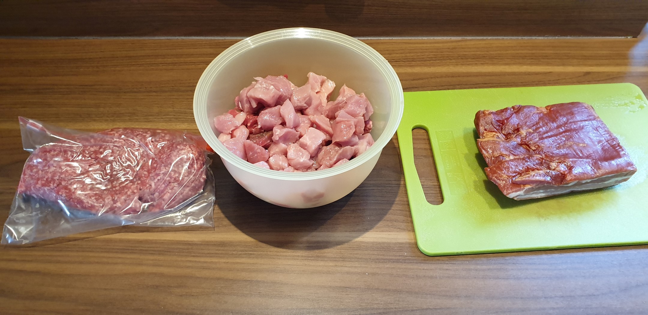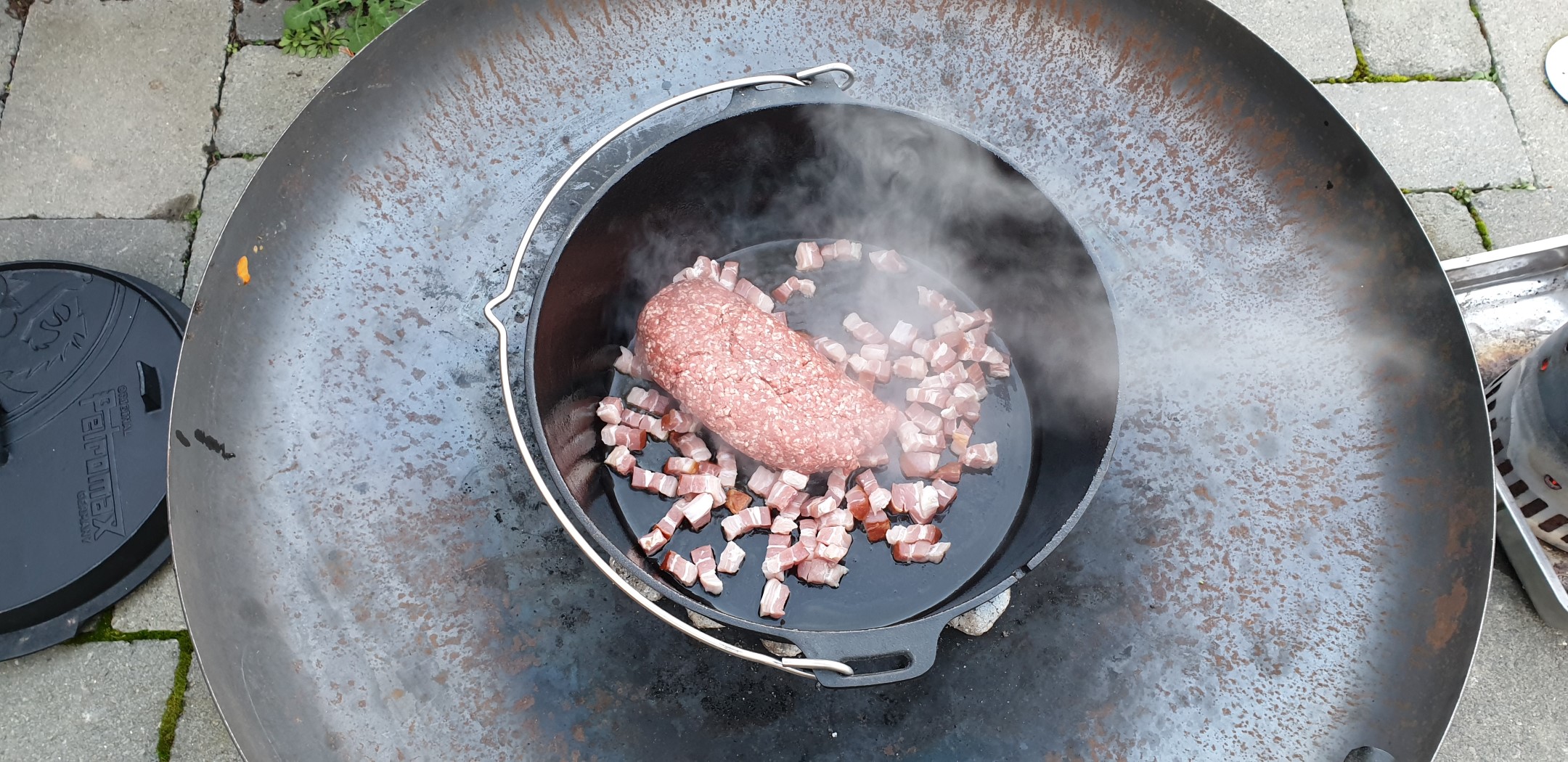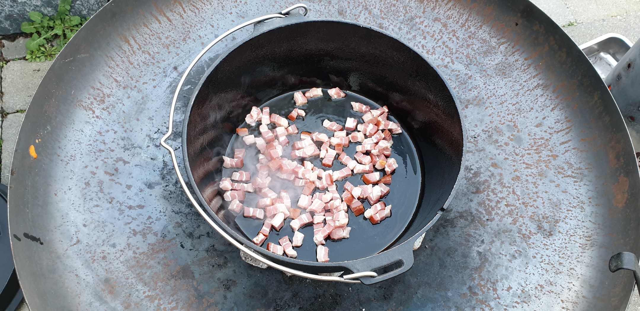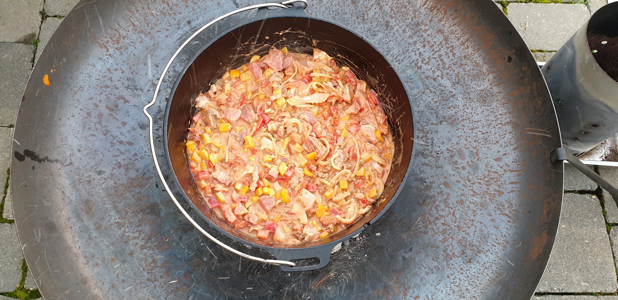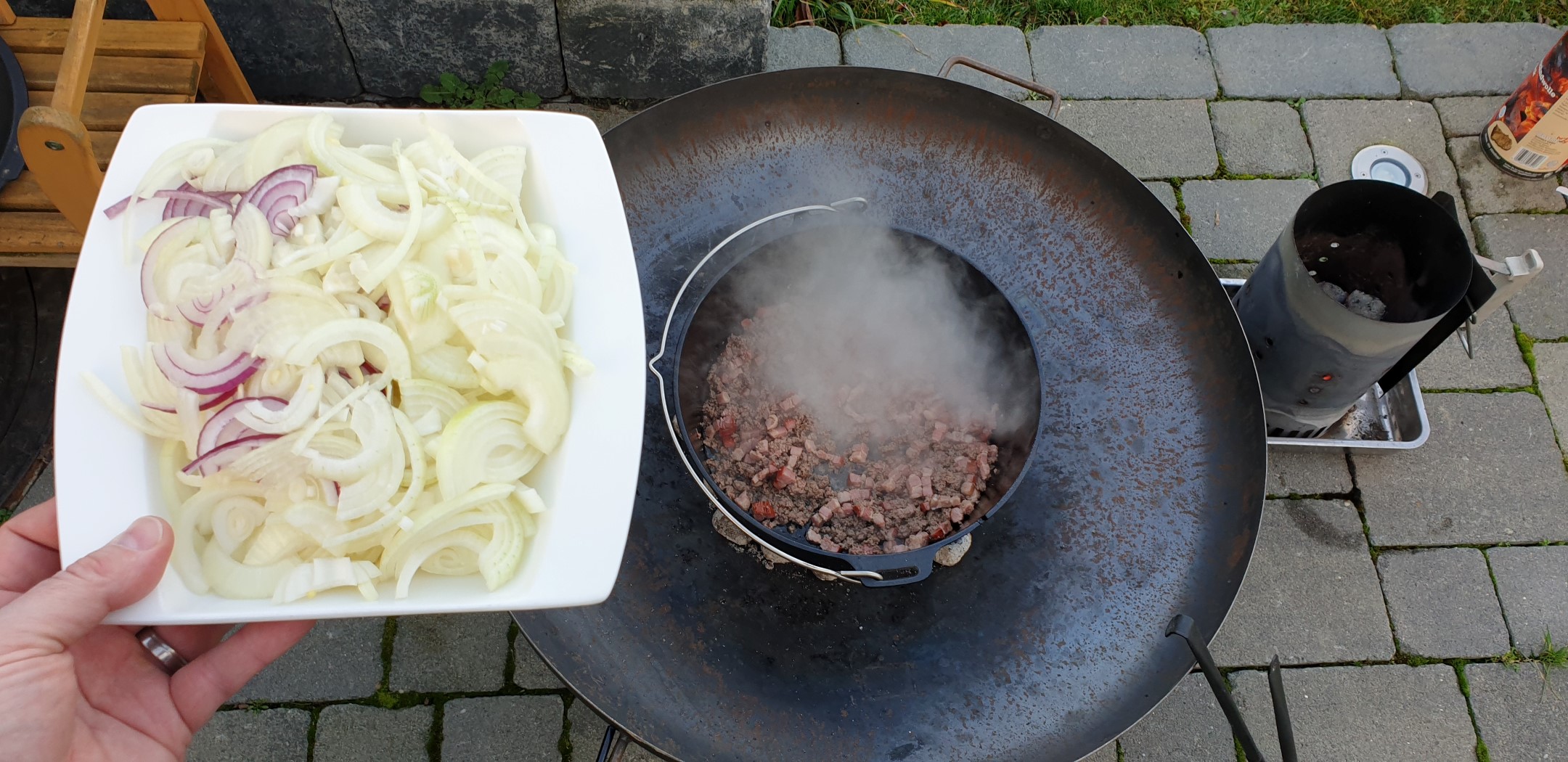 Als erstes wird der Speck von allen Seiten etwas im Dopf angebraten. Danach fügt ihr das Gehackte hinzu. Dieses wird dann so lange angebraten, bis es schön „krümelig“ geworden ist und etwas Farbe angenommen hat. Nun gebt Ihr die geschnittenen Zwiebeln hinzu und bratet die Zutaten weiter kurz an. Nun kommt als nächstes der Gulasch hinzu. Etwas befremdlich ist es, dass bei einem Pfundstopf der Gulasch zuvor nicht angebraten, sondern direkt in den Dutch Oven gegeben wird. Deswegen ist es auch wichtig, dass der Dopf gut eingeölt ist. Lieber zu viel Öl, als zu wenig!