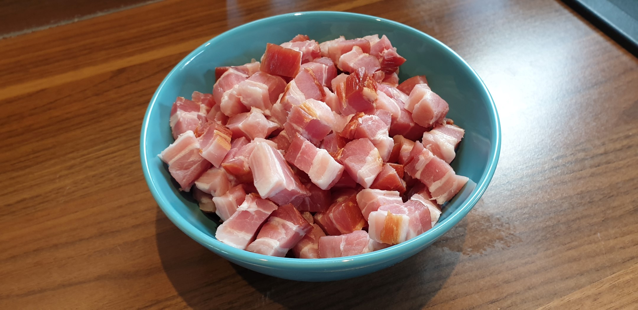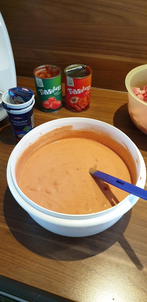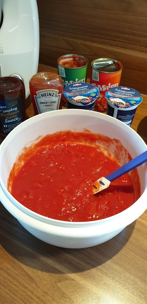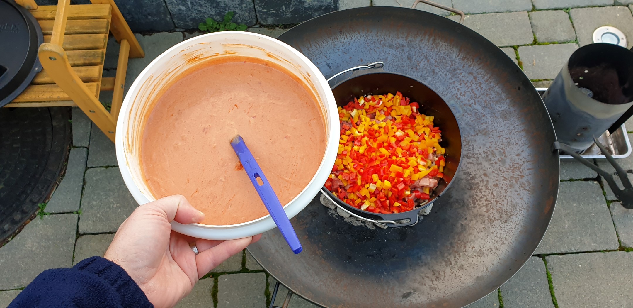 Die Paprikas werden entkernt und in kleine Stücke geschnitten. Die Zwiebeln werden in halbe Ringe geschnitten. Der Speck wird von der Schwarte befreit, etwas pariert und dann in kleine Stücke geschnitten. Die Sahne wird gemeinsam mit den Gewürzen, den gehackten und den geschälten Tomaten und den beiden BBQ Saucen in einer eigenen Schüssel verrührt.