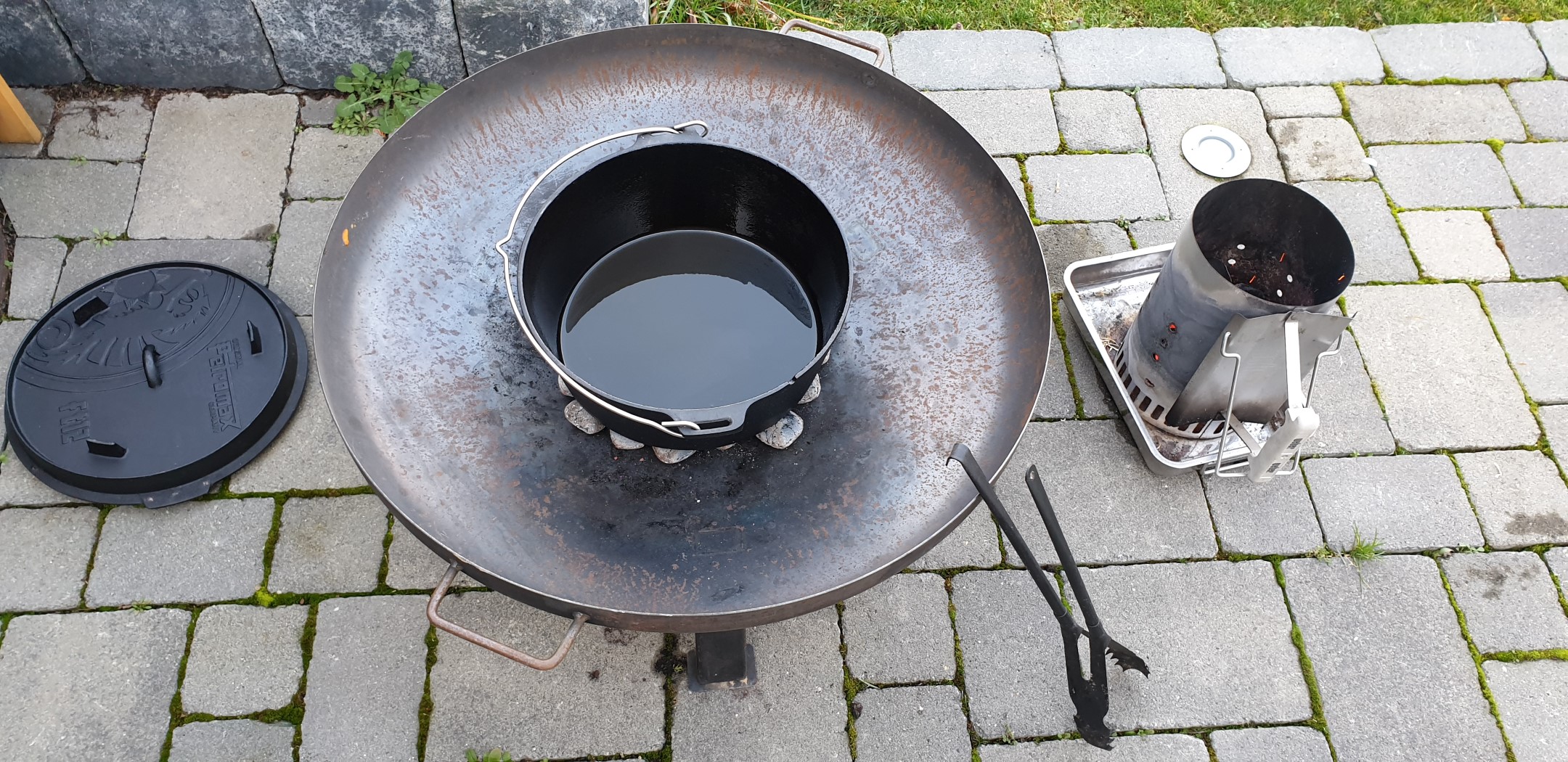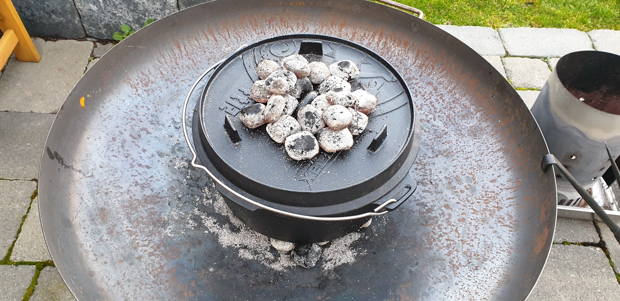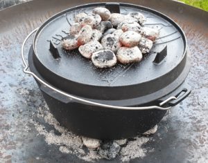 Nach der ganzen Schnippelarbeit werden zunächst die Briketts durchgeglüht. Dafür habe ich einen Anzündkamin zu 3/4 mit Briketts befüllt. Während die Briketts durchglühen, kümmert man sich um den Dutch Oven. Ich nehme immer das „alte“ Öl mit Küchenpapier aus dem Kessel heraus und öle dann nochmal sorgfältig mit frischem Oliven Öl die Wände und den Boden des Dutch Ovens neu ein. Nun darf der Dutch Oven in der Glut Platz nehmen. Ich nutze für meinen Dopf immer wieder gerne die Feuerschale als Unterlage. Damit der Pfundstopf bzw. die Zutaten nicht anbraten platziert man unterhalb des Dopfs nicht allzu viele Kohlen (es reichen ca. 6-8 Stk.). Die meiste Hitze kommt später dann von oben, vom Deckel aus (Oberhitze).