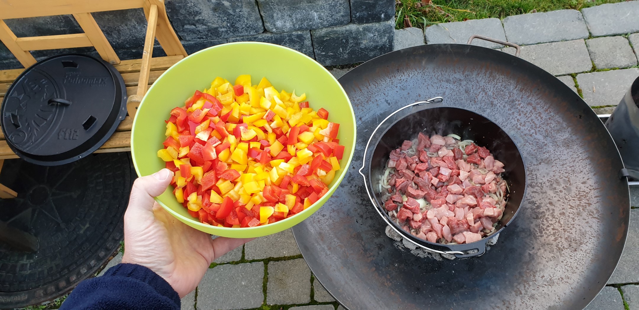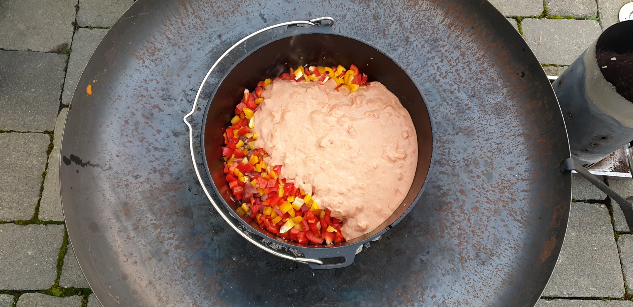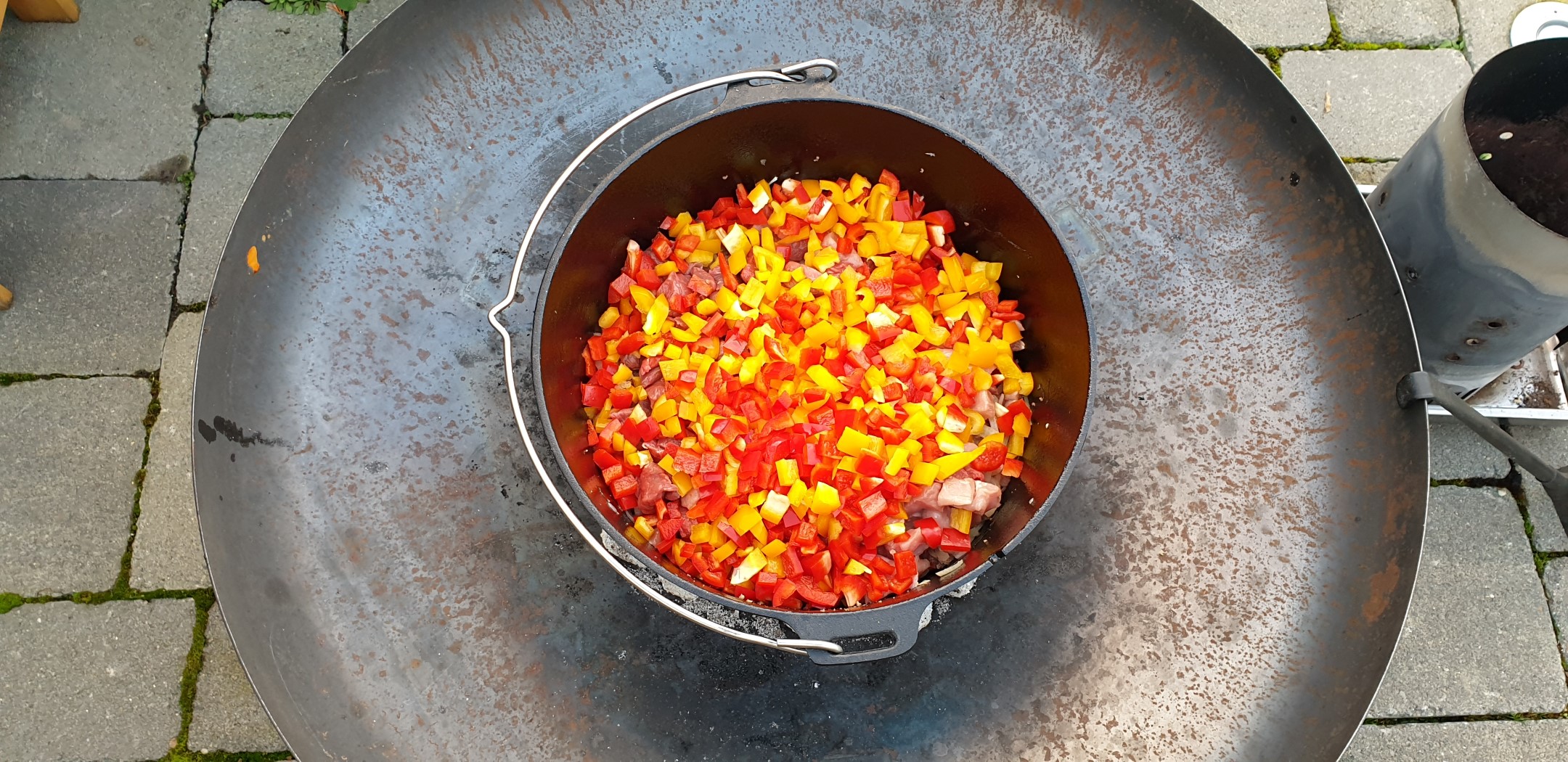 Als nächstes werden die Paprikas hinzu gegeben. Die bisherigen Zutaten werden nun im Dutch Oven schön miteinander verrührt. Danach wird die zuvor vermischte Soße in den Dopf gegeben. Nun wird alles wieder gut miteinander vermischt und der Dopf mit seinem Deckel verschlossen. Auf dem Deckel legt man nun einige durchgeglühten Briketts (ca. 20 Stk.) aus dem Anzündkamin. Nun kann das eigentliche Schmoren des Pfundstopf beginnen. Bis auf die gelegentliche Kontrolle mit Verrühren der Zutaten und der Kontrolle der Briketts ist eigentlich nichts mehr in den nächsten drei Stunden zu tun. Ggf. sollte man nach der Hälfte der Zeit noch einmal ein paar Briketts im Anzündkamin vorbereiten, um diese bei Bedarf nachlegen zu können. Mit dem Paprikapulver, Salz und Pfeffer kann man den Pfundstopf dann abschmecken. Frisch serviert streut man noch etwas frisch gehackte Petersilie über den Pfundstopf.