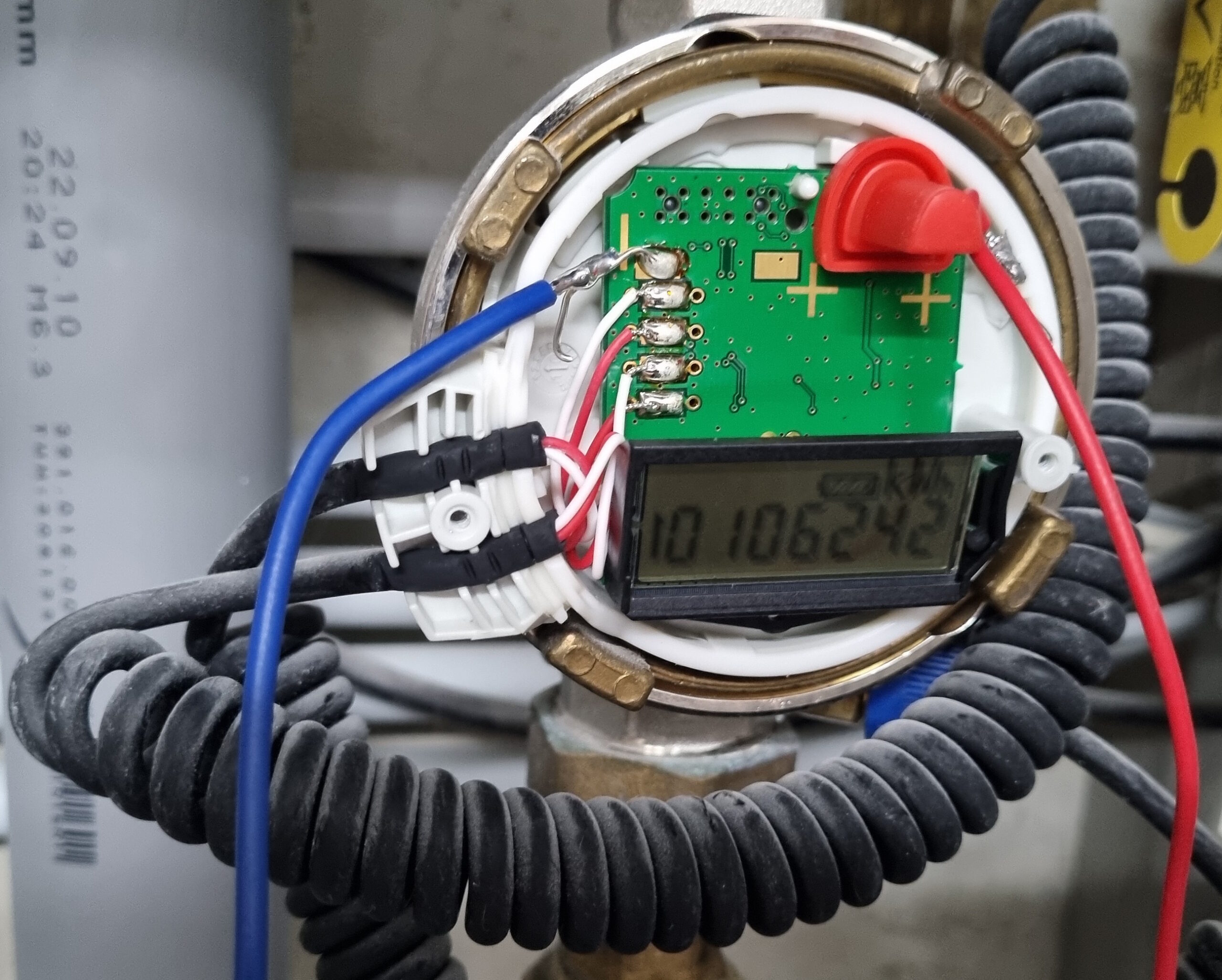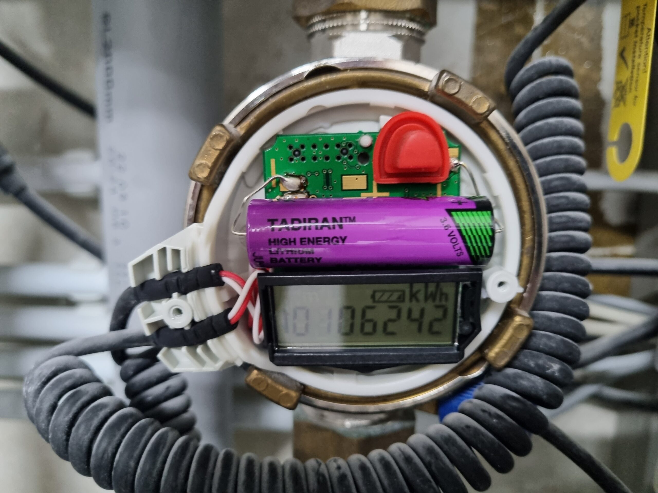 Nun kann man die Kappe des Wärmemengenzählers abnehmen und sieht anschließend das Innere des Zählers mit dem Akku.