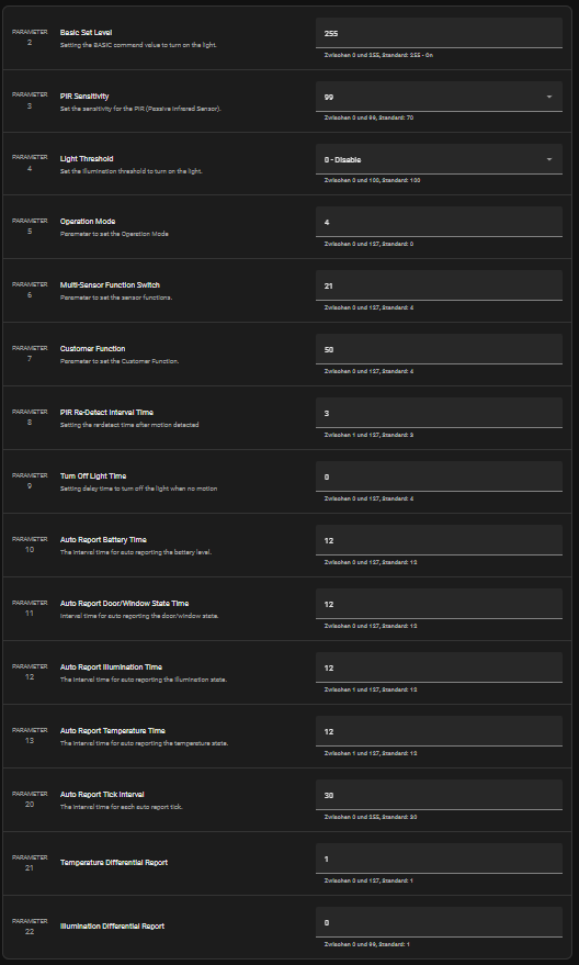 Die Parameter könnt ihr an folgender Stelle überprüfen / einstellen: Home Assistant UI -> Einstellungen -> Geräte & Dienste -> Z-Wave -> <euren devolo Bewegungsmelder> -> Geräte Info (und dort dann „Konfigurieren“. Dann erscheint die Z-Wave Gerätekonfigurations-Seite des Geräts. Hier kann man dann die gerätespezifischen Konfigurationsparameter für das ausgewählte Gerät verwalten und anpassen.