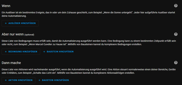 Kommen wir nun zur eigentlichen Automatisierung, die mittlerweile direkt in der Home Assistant Oberfläche konfigurierbar ist. Home Assistant bietet da eine leicht verständliche bzw. selbsterklärende Rule-Engine an. Natürlich kann man dennoch nach-wie-vor auch seine Automatisierung direkt als YAML-Code schrieben, was aber für Ungeübte eher schwieriger sein sollte.