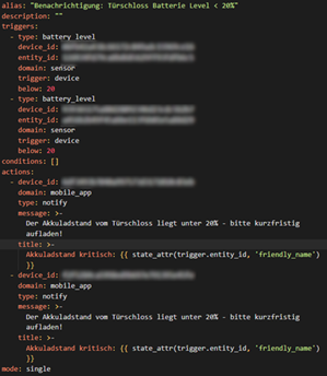 Um dem geringen Ladestand eines smarten Türschlosses zuvor zukommen kann man natürlich über eine Automatisierung den Ladezustand des Akkus prüfen lassen und sich dann z.B. bei einem Stand von weniger als 20% per Push-Mitteilung darüber informieren lassen.