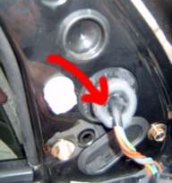 Auf diesem Foto hier seht Ihr das Spiegeldreieck von Innen. An der markierten Stelle, wo bereits die Verkabelung für die Spiegelheizung (je nach Ausstattungsvariante) und die elektrischen Spiegelverstellung durchgeführt wird, habe ich auch den in.Pro Aussentemperaturfühler in das Innere des Spiegels geführt. Dort wird auch von Peugeot und vielen anderen Automobilherstellern der Aussentemperaturfühler von Werk aus untergebracht. Problematisch ist dann die weitere interne Verkabelung. Dafür muss der Spiegel nun noch zerlegt werden. Von Innen müssen die drei 10er Schrauben und die Steckeverbindung gelöst werden. Dann haltet Ihr den Spiegel in eurer Händen.