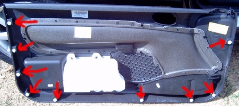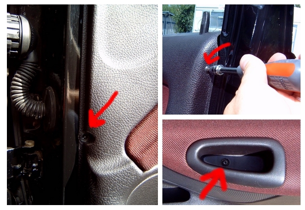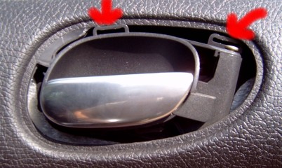 Dann muß noch die innere Türöffnerverkleidung ausgehebelt werden – siehe dazu folgendes Bild: