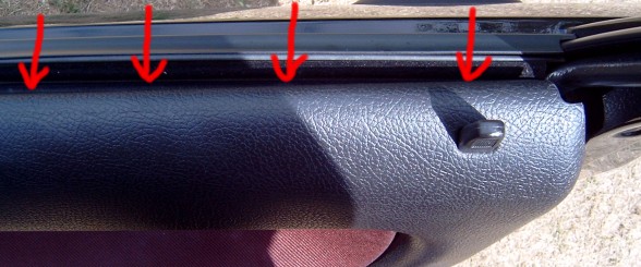 Nun hebt man die gesamte Türverkleidung bei heruntergefahrener Seitenfenster an der Stelle hoch, wo die Scheibe hinter den Gummis verschindet. Das hilft nachher die Verkleidung leichter von der Tür zu lösen.