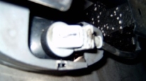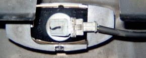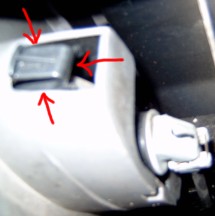 Das Nebelschlussleuchtengehäuse bekommt Ihr nun ganz einfach aus der Schürze bzw. Halterung heraus. Dafür müßt Ihr nur von der linken Seite her (siehe Pfeilmarkierungen auf dem Bild) die Feder ein klein wenig eindrücken und schon könnt Ihr das Gehäuse der Nebelschlußleuchte der Heckschürze entnehmen.