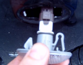 Auf den folgenden Abbildungen seht Ihr den herausgezogenen Blinker. Nun hält man den Blinker-Anschlussstecker fest und dreht das Blinkergehäuse eine halbe Drehung. Schon kann man es ganz einfach von der Fassung abziehen.