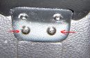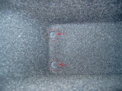 Klappt man die Armlehne auf, erkennt man an den beiden leichten Vertiefungen, wo die Armlehne von oben verschraubt wird (siehe rote Markierungen):