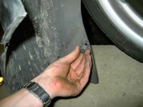 Als nächstes sollte man das Kunststoff-Teil einfach entfernen können. Dahinter verbergen sich auf jeder Seite jeweils eine Mutter, welche die Heckschürze mit dem Kotflügel verbindet. Diese Muttern müssen gelöst werden.