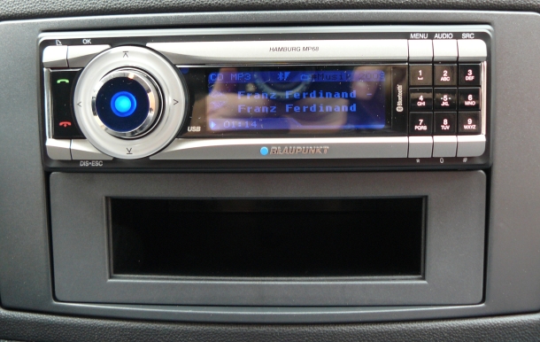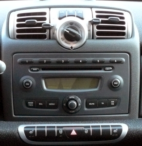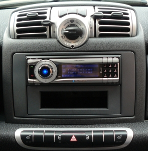 Unser Smart Cabrio war lediglich mit einem Standard Smart Radio, Typ Radio 9, ausgestattet. Da es von den Funktionen her eher mager ausgestattet war und speziell keine MP3-Unterstützung bot, haben wir uns für ein neues Autoradio entschieden, genauer gesagt für das Blaupunkt Hamburg MP68. Das Hamburg MP68 verfügt über eine integrierte Bluetooth Freisprecheinrichtung, verwaltet bis zu 500 Telefonbucheinträge und verfügt neben der Bluetooth-Schnittstelle für kabellose Verbindungen auch noch zusätzlich über einen USB-Steckplatz für externe Datenspeicher.