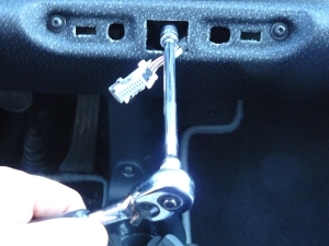 Nun gelangt man an der bereits angesprochenen Schraube, die die Mittelkonsolenverkleidung an das Armaturenbrett fixiert. Hier sollte man mit einem magnetischen Torxschraubendreher arbeiten, damit die Schraube nicht versehentlich ins Innere des Armaturenbretts verschwinden kann. Diese Schraube muss entfernt werden, um dann anschließend die Verkleidung „abziehen“ zu können.