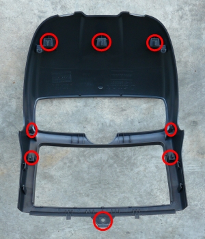 Auf den folgenden beiden Abbildungen sieht man, wie die Mittelkonsolenverkleidung abgezogen aussieht und an welchen Stellen dieses mit der Armaturentafel verbunden ist.