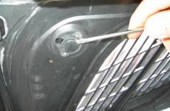 Nun einen Silikonstreifen auf der Innenseite der Motorhaube auftragen. Anschließend das Gitter einsetzen. Dabei sollte man jedoch höchst sorgfältig vorgehen, um sich unnötige Arbeit zu ersparen, denn verrutscht das Gitter muss man dieses wieder entnehmen und erst einmal das verschmierte Silikon entfernen. Also einfach mit Ruhe anbringen. Das Gitter lässt sich dann, wie dargestellt, vorübergehend mit Kabelbindern fixieren, um ein nachträgliches Wegrutschen zu verhindern. Anschließend sollte man zur besseren Haftung noch etwas Silikon oder Scheibenkleber an den Rändern auftragen, so dass der Rand gut im Kleber sitzt. Für den Einbau ist von der Nutzung von Heißkleber eher abzuraten, da dieser nicht besonders gut, wegen seiner Hitzebeständigkeit (Sonneneinwirkung auf der Motorhaube) geeignet ist. Den Silikon bzw. Kleber sollte man gut trocknen lassen (mind. 1-3 Tage). Anschließend können dann die Kabelbinder entfernt werden.