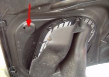 Und nun zur Durchführung der Umbauaktion: Als erstes muss natürlich die Motorhaube geöffnet werden. Nun mit Hilfe eines Schraubendrehers, o.ä. Werkzeug den Kunststoff-Halteclip der Hutze von der Innenseite der Motorhaube wie dargestellt lösen.