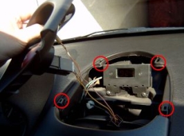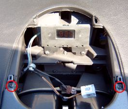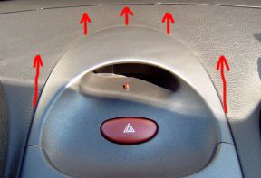 Am besten setzt man die Hand in der Vertiefung für die Uhr/den Bordcomputer an, um die Verkleidung abzuziehen. Wie man auf der Abbildung sehen kann ist die obere Verkleidung lediglich geklammert und gesteckt (siehe rote Markierungen).