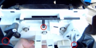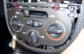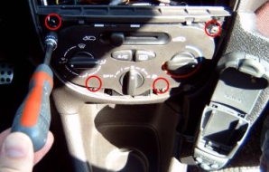 Nun müssen weitere vier Torxschrauben entfernt werden (siehe dazu die Markierungen auf der folgenden Abbildung links). An den beiden rechten Schrauben ist nicht nur das Heizungsbedienelement, sondern auch (falls vorhanden) die Originale Peugeot Mobiltelefonkonsole befestigt.Auf der rechten Abbildung seht Ihr, wo die Heizungskonsole noch mit zwei Haken zusätzlich gehalten wird.