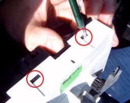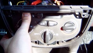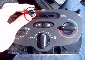 Nun muss das Bedienelement zerlegt werden, um Zugang zu den defekten Birnchen zu erhalten. Dafür muss man zuerst den Schieberegler vorne mit ein wenig Kraftaufwand abziehen (siehe folgende Abbildung links). Anschließend muss man die beiden Haken des Elementes von oben mit einem Schraubendreher entriegeln bzw. eindrücken, um dann den vorderen Teil der Konsole vom hinteren Teil abziehen zu können (siehe dazu die folgende rechte Abbildung). Dann hat man endlich Zugang zu den entsprechenden Birnchen der Innenbeleuchtung des Heizungsbedienelementes.