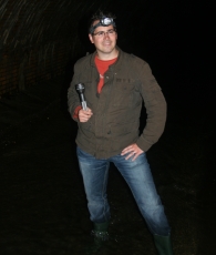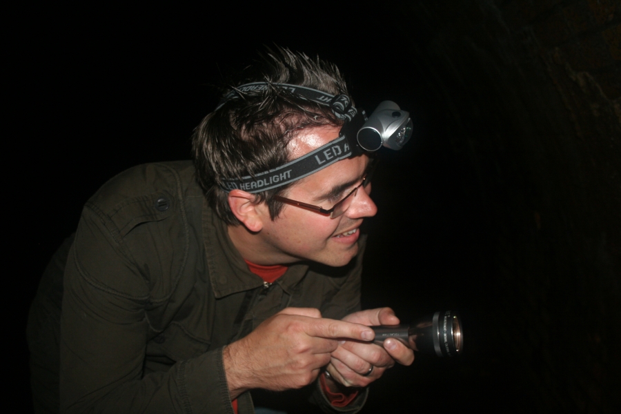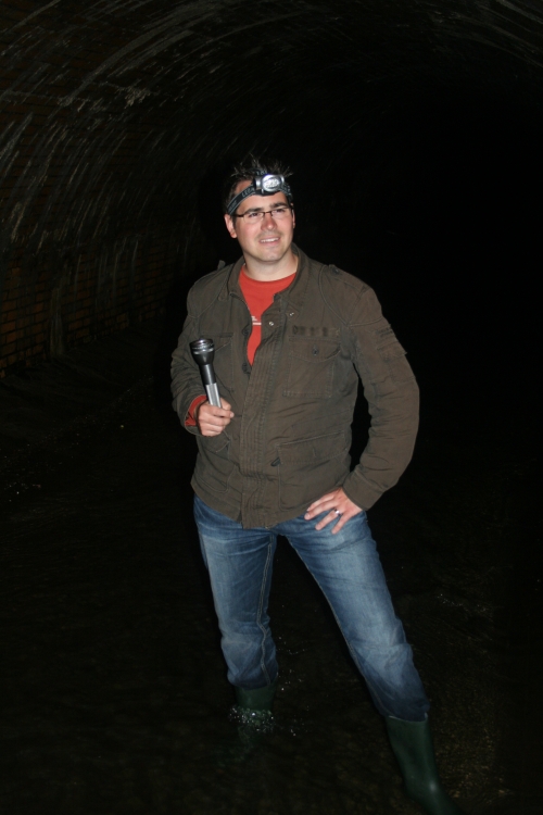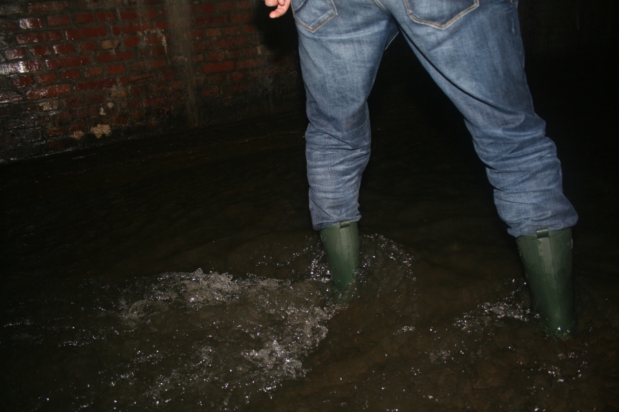 Der Einstieg wurde unmittelbar vor dem sogenannten Wurm-Loch vorgenommen – also *schwub, hinein in die Wurm und hinein in die dunkle Röhre. Die Höhe wird in der Mitte ca. zwei Meter betragen und schätzungsweise drei bis vier Meter in der Breite, also ein großes Oval. Durch den Regen wurde man zeitweise von den Seiten auch noch „berieselt“, wenn man nicht aufpasste. In der Röhre herrschte absolute Finsternis. Nach dem Eingang befand sich der Cache einen guten Kilometer entfernt und durch den sehr rutschigen Boden benötigte man zum Erreichen des Ziels (ohne sich dabei mit voller Wucht auf die Nase zu legen) dann doch schon einige Zeit. Wir haben natürlich unterwegs einige Fotos gemacht, was uns sicherlich nochmals extra Zeit kostete und unterm Strich dann dazu führte, dass wir ca. 1 1/2 Stunden „Untertage“ waren. Auf dem Weg zum Versteck mussten wir natürlich darauf achten, dass wir nicht auf dem sehr rutschigen Boden ausrutschten und samt Technik ins Wasser fielen und, dass wir mit unseren Haaren nicht alle vorhandenen Spinnennetze zerstörten. Durch den Regen musste auch schon mal die Seite gewechselt werden, da von diesen weitere Zuläufe mit Wasser aus den Wänden ragten, die nun natürlich reichlich Wasser führten.