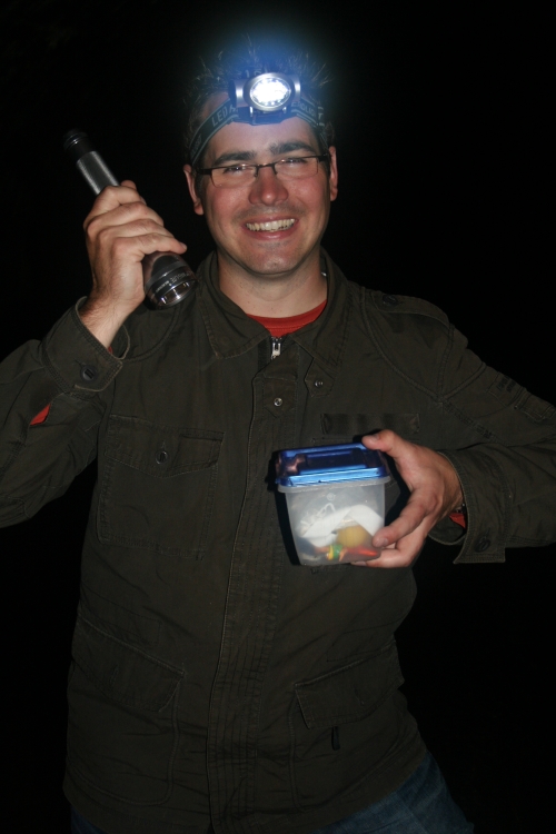 Irgendwann machte die Röhre dann einen Rechtsknick, so dass man auch nicht einmal das schwache entfernte Licht vom Einstieg sehen konnte – es war wirklich Pech-Schwarz. Kein Licht weit und breit. Wir schalteten mal für eine Minute das komplette Licht aus und lauschten den Geräuschen. Richtig spannend… Für Personen mit Platzangst und Angsthasen ist das hier unten mal gar nichts. Je näher wir dem Versteck kamen, desto lauter wurde es. In der Ferne hörte man Autos über einen Gulli-Deckel fahren und von irgendwo her strömte laut Wasser in die Röhre. Irgendwann stellte man sich die Frage, ob man nicht schon an dem Versteck vorbei gelaufen sei, denn vom Gefühl her, war man weitaus weiter als nur einen Kilometer gelaufen. Aber in der Beschreibung des Caches stand fett markiert, dass man den Cache eigentlich nicht verfehlen könne, da er ausreichend markiert sei. OK, also weiter und nach ein paar Minuten sahen wir dann „die Markierung“. Oberhalb des Verstecks hatte der Owner drei starke Reflektoren in die Wand geschlagen, die jetzt natürlich durch das Licht der Taschenlampe deutlich diese Stelle markierten. Und da lag er dann auch, der Cache. Hurra… gefunden! Um 18:30 Uhr haben wir dann unseren Fund geloggt und uns dann wieder auf den Rückweg gemacht. Auch auf dem Rückweg haben wir dann noch das eine oder andere Bild geschossen und ein kurzes Video (mit meinem Mobiltelefon erstellt) habe ich auch noch aufgezeichnet. Leider kann man durch die absolute Dunkelheit, trotz zweier Kopflampen, Beleuchtung am Mobiltelefon und der Taschenlampe auf dem Video nicht viel erkennen.