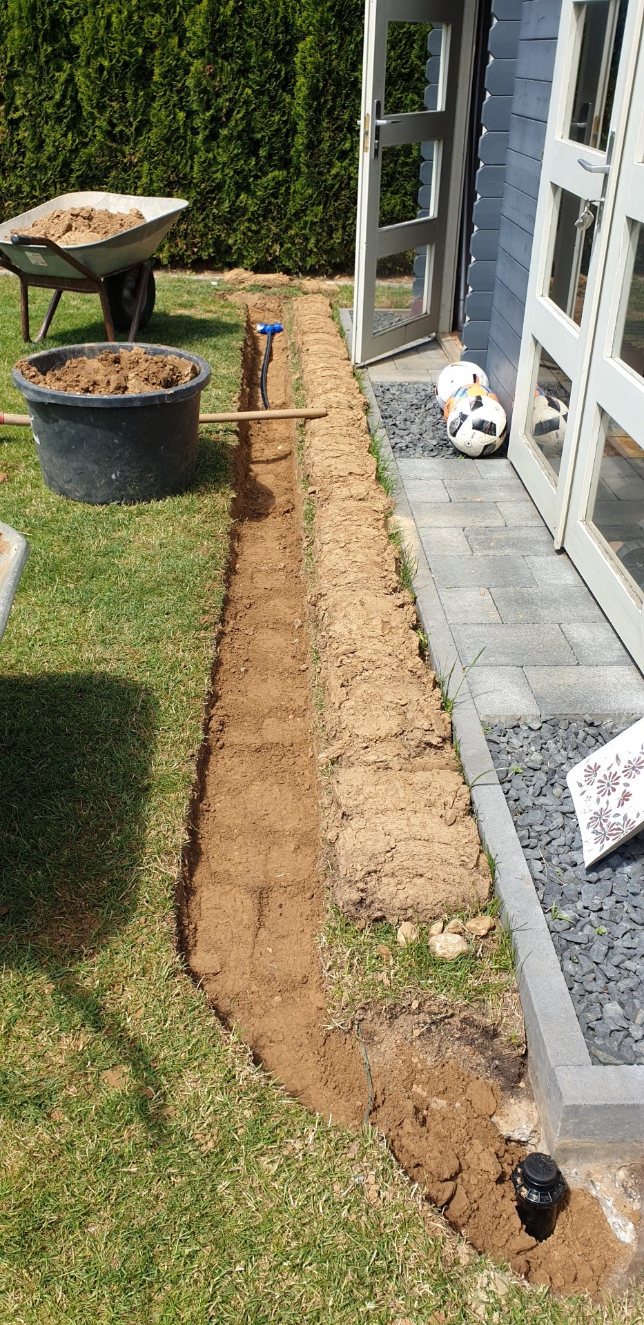 Nun kam das „uncoole“ an dem Projekt: Der Bodenaushub! Ich habe mit Hilfe von Metall-Stangen und Mauerschnur den geplanten Verlauf des Leitungsrohr auf dem Rasen geplant und dabei versucht möglichst effektiv vorzugehen, damit ich möglichst hohen Druck an den Ventilen habe. Als nächstes wurde die Grasnarbe abgestochen, vorsichtig auf Seite gelegt und der Bodenaushub vorgenommen. Hier bin ich auf Spatentiefe gegangen. Ich werde, wie auch alles andere bisher bei mir im Garten, zum Winter hin, die Leitungen mit Hilfe von Druckluft komplett Wasserfrei pusten. Habe den Mutterboden auf Schubkarren und in Spießbütten „geparkt“. Sektionsweise wurde das Rohr von mir in der Erde verlegt und dann auch wieder mit Mutterboden bedeckt. Danach konnte dann die Grasnarbe wieder aufgelegt werden. Habe diese dann mit einem Gummihammer angedrückt und in die korrekte Position gebracht. Noch ein Tipp am Rande: Das PE-Rohr bzw. die 100 Meter Rolle Rohr sind sehr widerspenstig. Hier solltet Ihr darauf achten, das vernünftig abzurollen und im Idealfall die Montage bei warmen Temperaturen vorzunehmen. Je wärmer bzw. je länger das Rohr in der Sonne liegt, desto einfacher lässt es sich damit arbeiten.